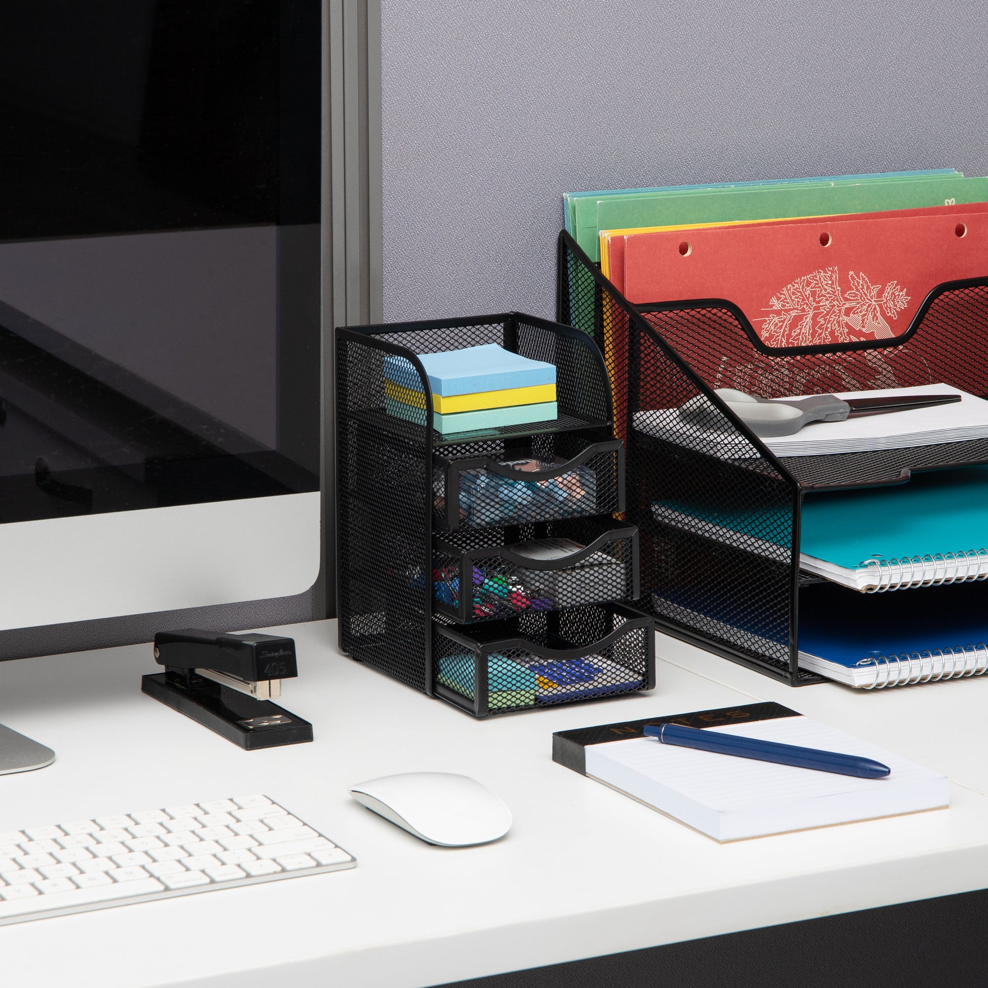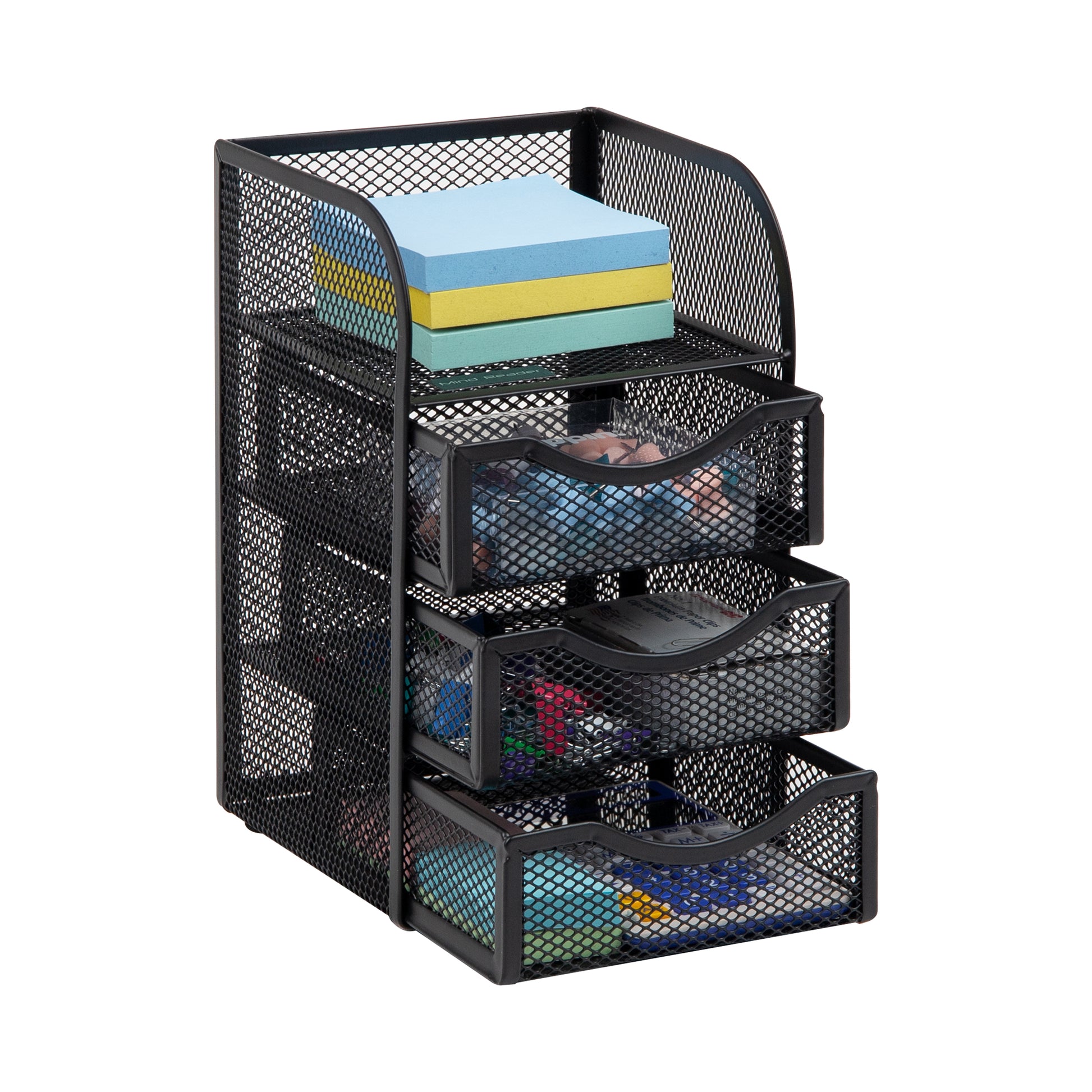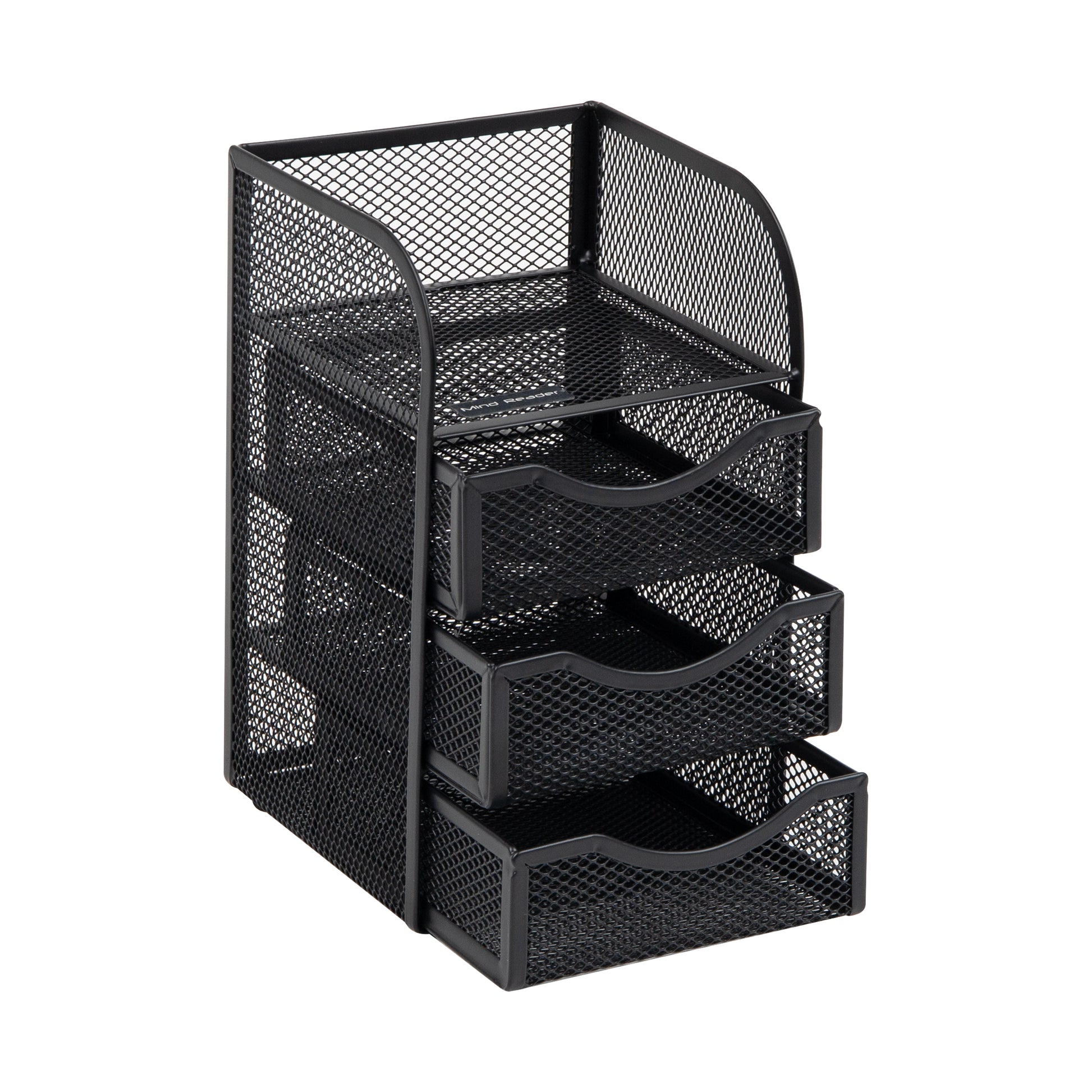 Transform your workspace, makeup table, or kitchen counter with this versatile and stylish black wire mesh organizer. Designed to eliminate clutter and save space, this multi-section organizer features pull-out drawers to store and sort various items, from office and school supplies to jewelry, makeup, crafting gear, or kitchen condiments.