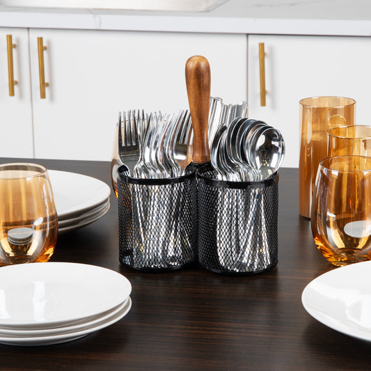 Mind Reader 3-Compartment Mesh Organizer Caddy with Wooden Handle, Multi-Purpose Desktop or Countertop Storage, Metal Mesh, Black