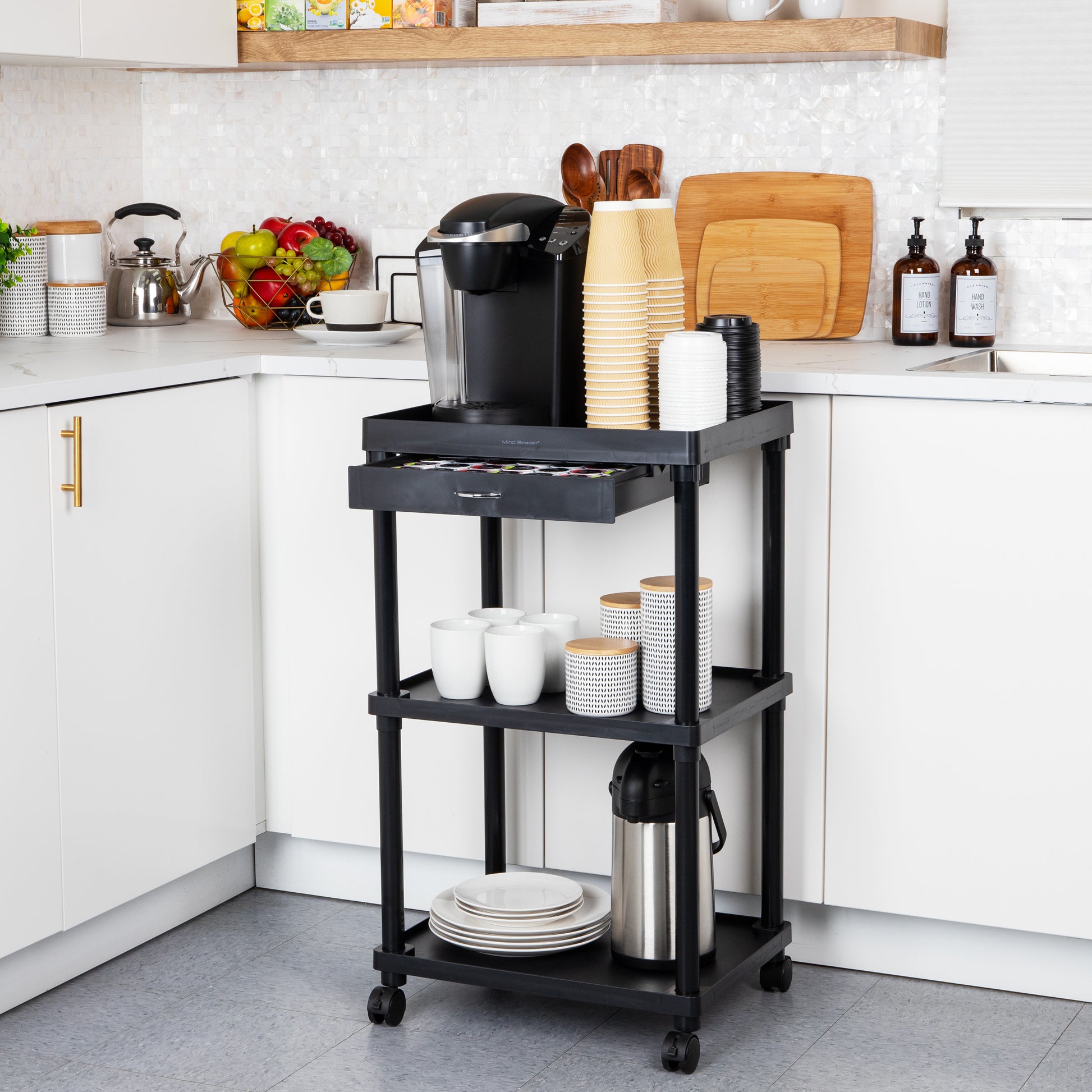 When it's time for entertaining, transform this versatile cart into a chic coffee station or bar cart. It easily holds extra cups, plates, napkins, utensils, and supplies on the bottom shelves, becoming a functional centerpiece at your parties.