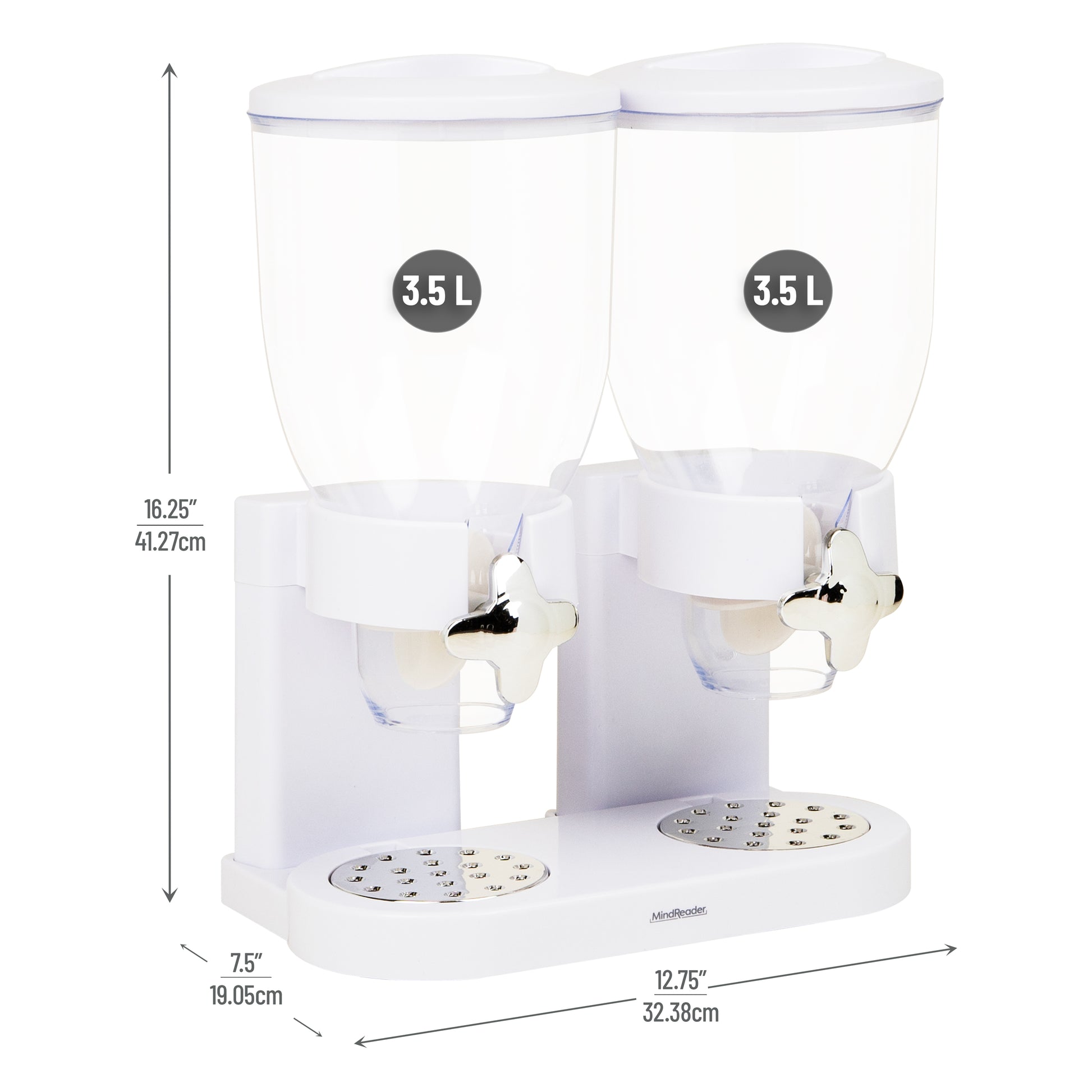 - Dual Dispensers: Store and dispense cereal, granola, nuts, coffee beans, and more in these durable 3.5 liter containers. Crafted from premium, shatterproof plastic, this food dispenser is designed to withstand daily use while maintaining its sleek, scratch-free appearance. The clear canisters make it easy to monitor the remaining contents.