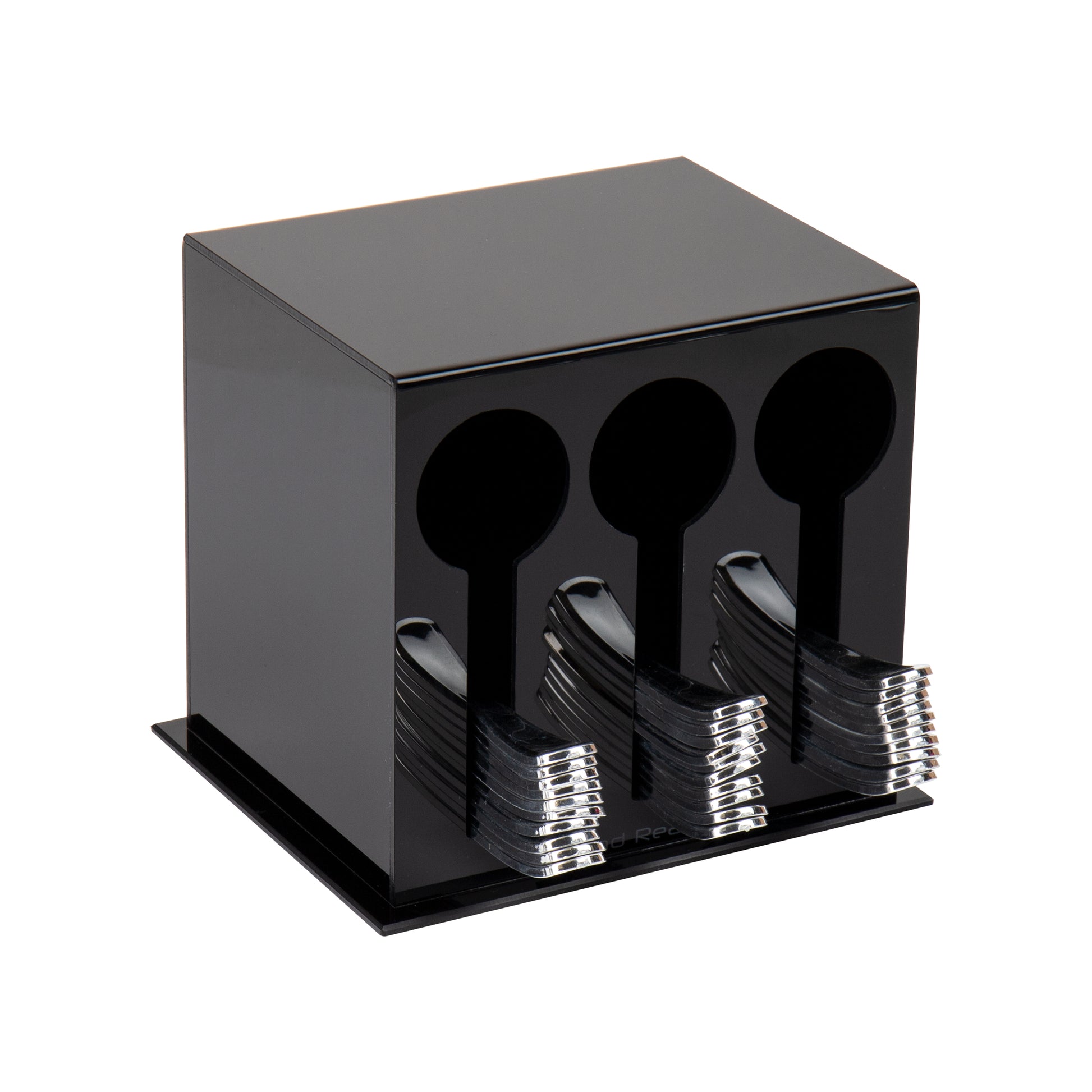Elegant and sleek, the neutral black design and compact look of this cutlery holder will blend effortlessly into any decor when used in a restaurant, coffee shop, or diner environment. Save space in your breakroom, pantry, or cafe with this sleek, compact design.