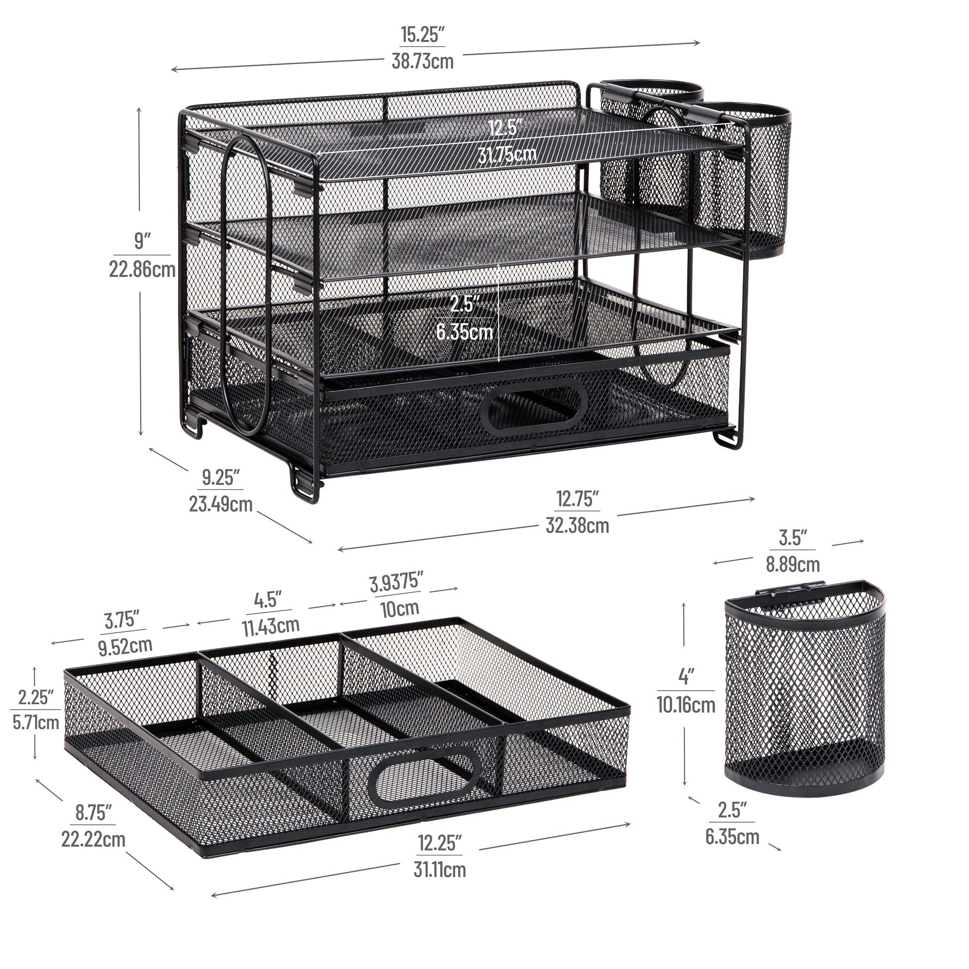 Mind Reader Mesh Desk Organizer, 3 Trays, 1 Drawer, 2 Pen Holders, Office Desktop Organizer, Metal Mesh, Black