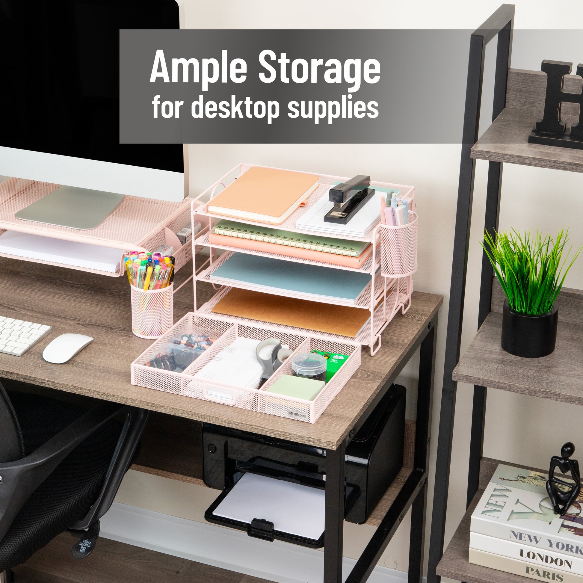 Mind Reader Mesh Desk Organizer, 3 Trays, 1 Drawer, 2 Pen Holders, Office Desktop Organizer, Metal Mesh, Pink