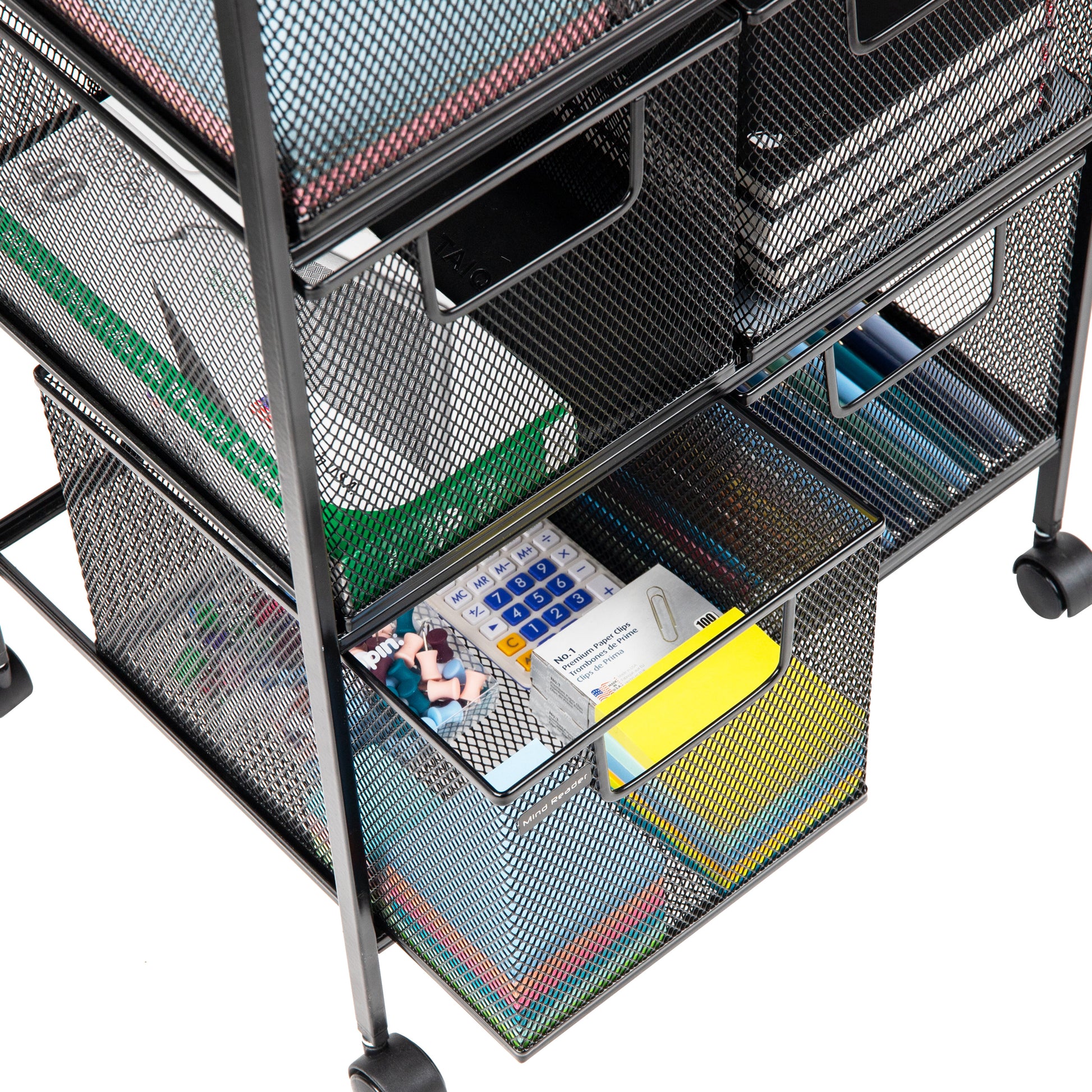 Built with a sturdy metal mesh frame, the cart provides clear visibility of contents and dependable durability for daily use. Each drawer glides out smoothly and holds up to 11 lbs. (5 kg), offering ample room for organizing multiple categories of office materials. The omnidirectional wheels allow for easy repositioning across your workspace, while locking casters ensure the cart stays securely in place during use.