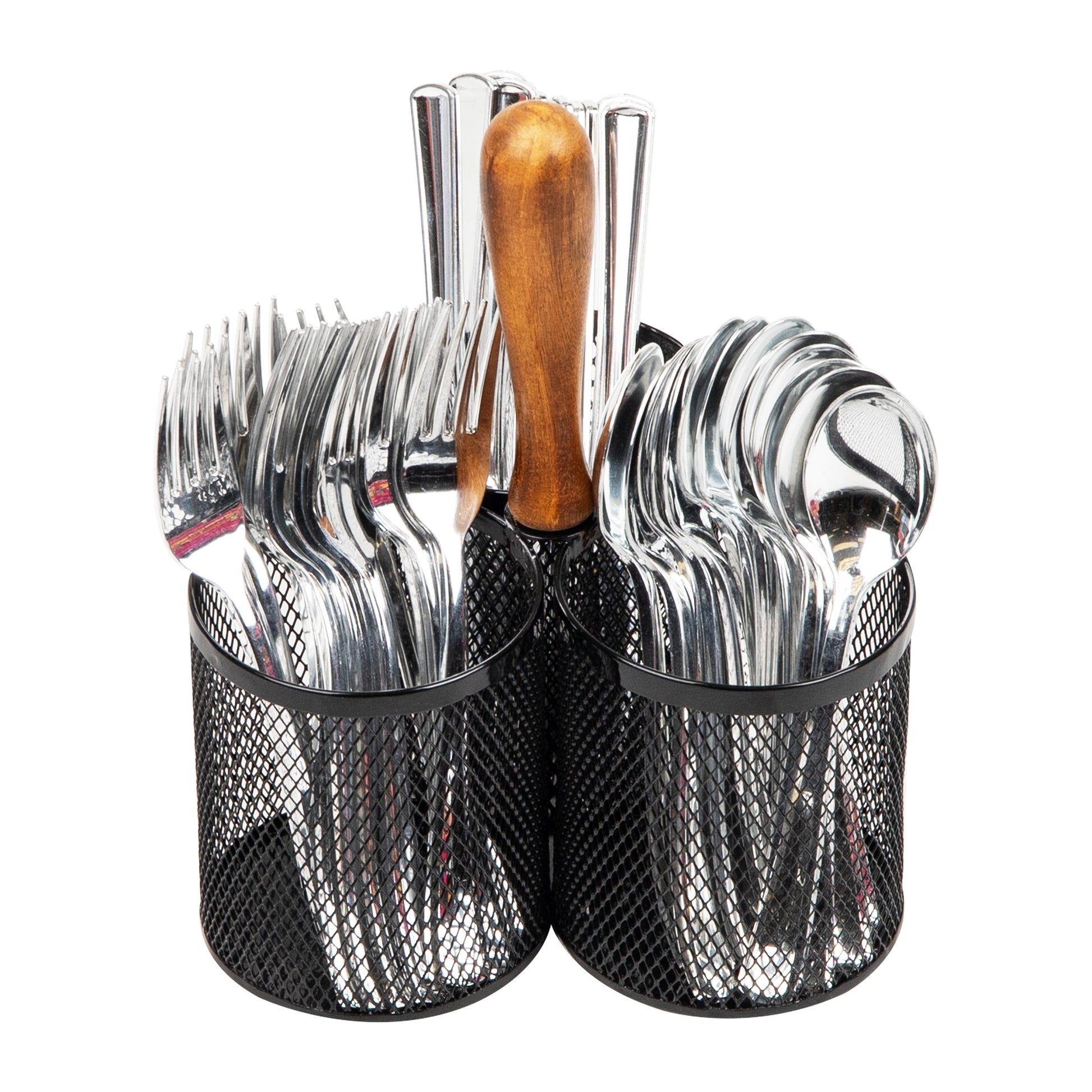 Mind Reader 3-Compartment Mesh Organizer Caddy with Wooden Handle, Multi-Purpose Desktop or Countertop Storage, Metal Mesh, Black