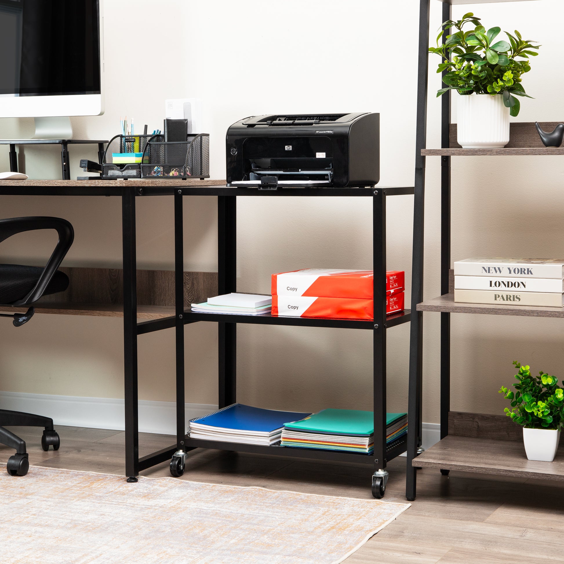 The industrial-inspired cart's smooth-gliding wheels ensure effortless room-to-room movement when needed. Constructed from steel, it offers sufficient clearance between tiers for storing bottles, glassware, office supplies, bathroom products, and more. Two locking wheels add stability and versatility as an end table, nightstand, or kitchen island.