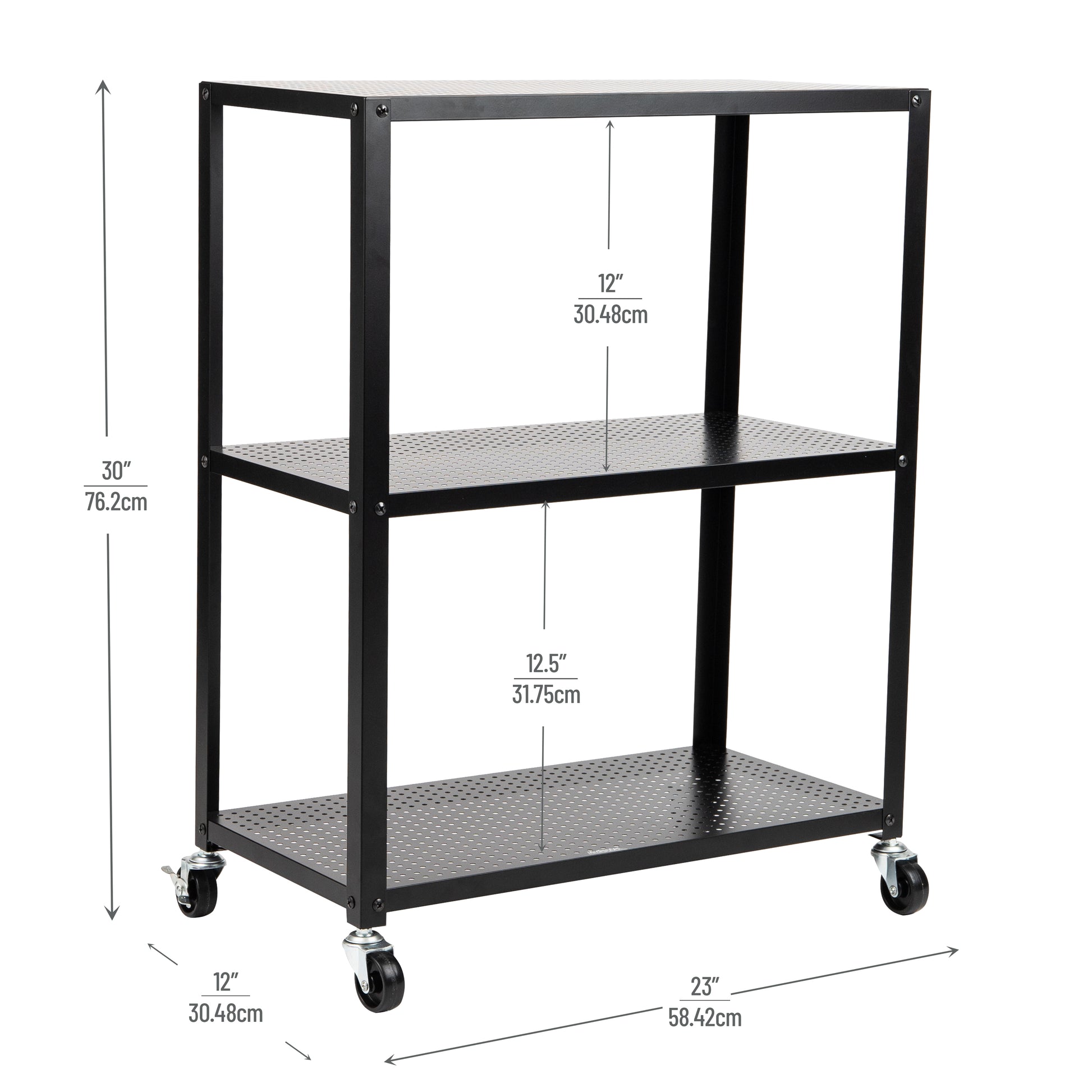 - Dimensions: This rustic, lightweight cart measures 23 long x 12 wide x 30 tall (58.42 x 30.48 x 76.2 cm)and the shelves have a weight capacity of 55 lbs.