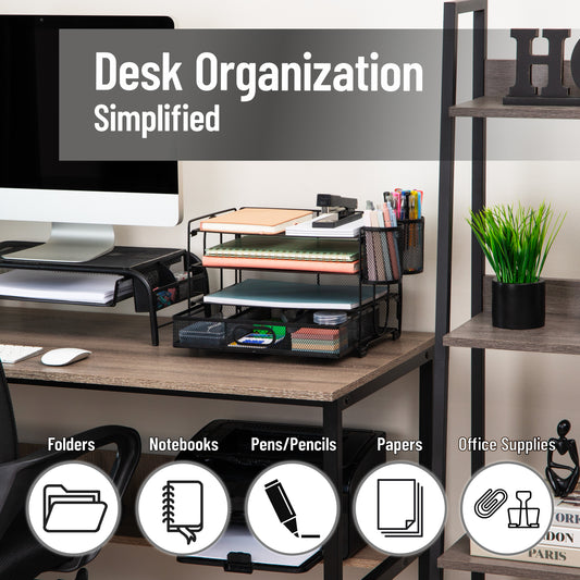 Mind Reader Mesh Desk Organizer, 4 Trays, 1 Drawer, File Holder, 2 Pen Cups, Office Desktop Organizer, Metal Mesh, Black