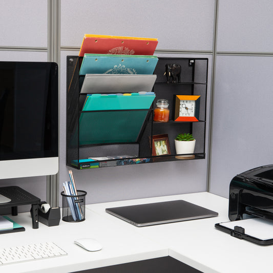 Mind Reader 4-Tier Vertical File Storage and Shelves, Desktop Organizer, Wall Mount, Office, Metal Mesh, 22.5"L x 4"W x 16"H, Black