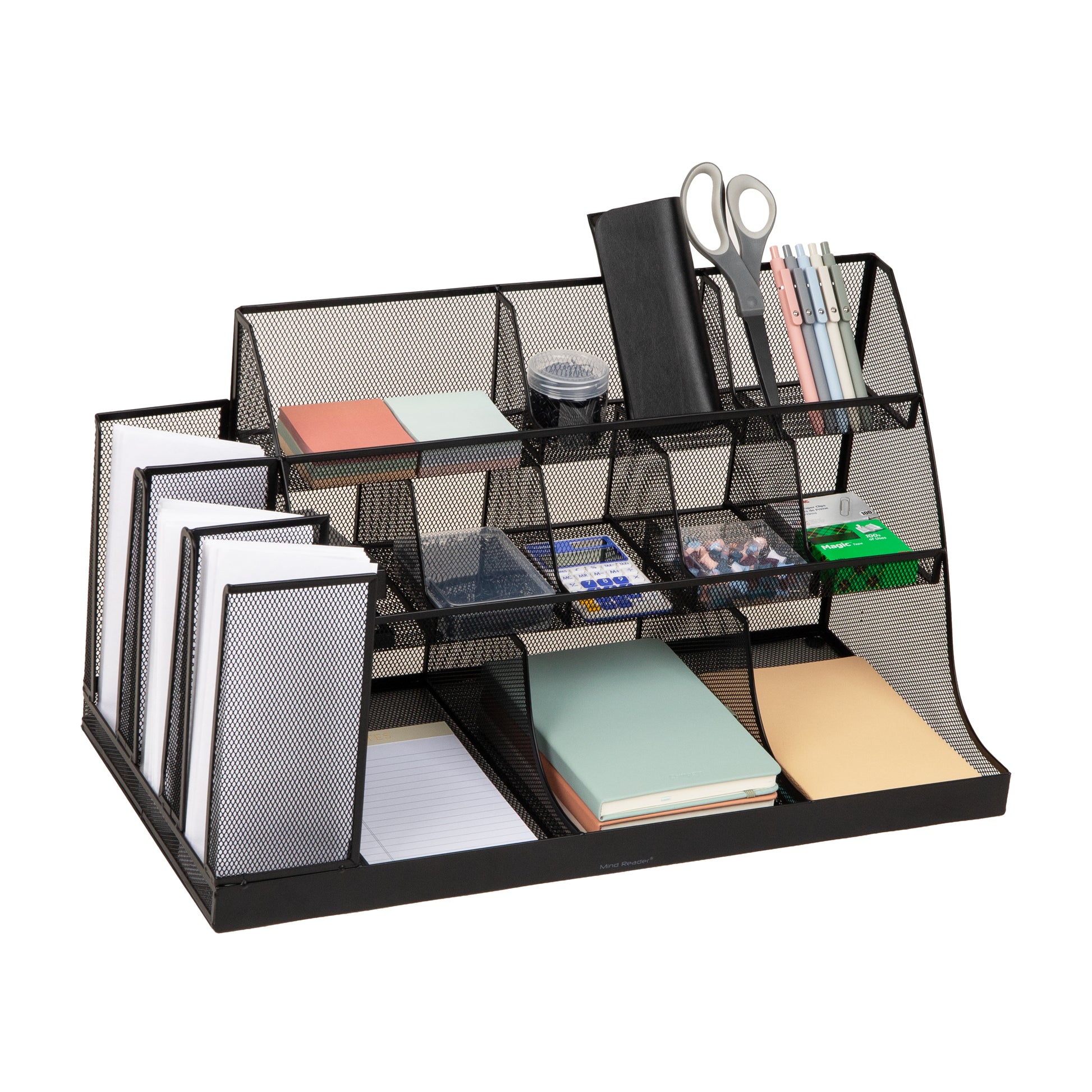 Keep your breakroom or desktop organized with this spacious 3-tier metal mesh storage rack. Featuring 14 compartments in a variety of sizes, this multipurpose organizer is ideal for sorting cups, stirrers, napkins, utensils, and other breakroom essentials. It also functions as a compact supply caddy for pens, tape, notepads, and other desktop necessities.