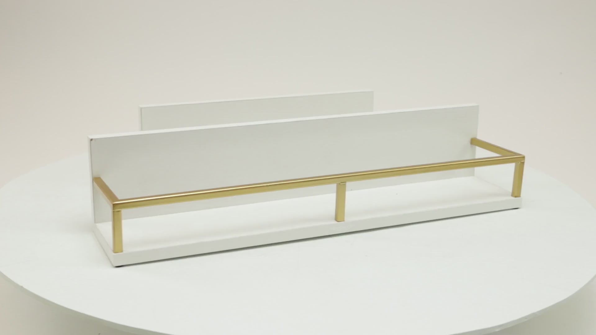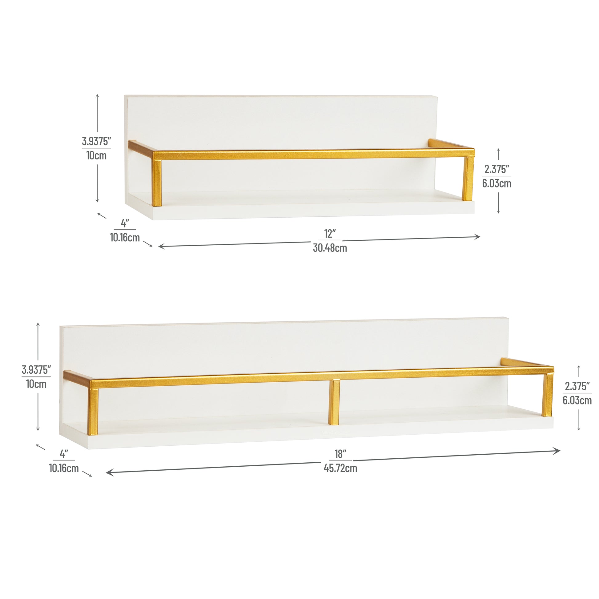 Enhance your office or home workspace with the Mind Reader White & Gold Floating Shelves. This set includes two wall-mounted shelves—one 18 inches wide and one 12 inches wide—crafted from sleek white MDF and accented with a gold-tone metal rail. These contemporary shelves offer a stylish solution for storing decor, office supplies, plants, and more, while keeping your desk or floor space clear.