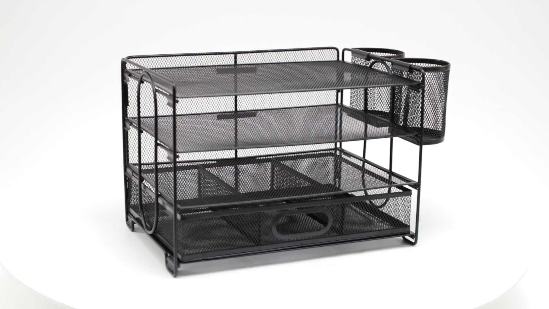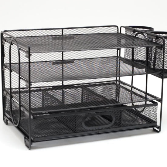 Streamline your desktop with this all-in-one mesh organizer from Mind Reader. Designed with three spacious horizontal trays, two integrated pen cups, and a pull-out drawer, this compact unit keeps paperwork, writing tools, and office supplies neatly stored and easily accessible. Its durable all-metal mesh construction adds a modern touch while withstanding daily use in busy office environments.