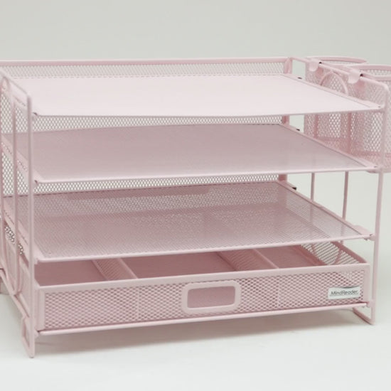Mind Reader Mesh Desk Organizer, 3 Trays, 1 Drawer, 2 Pen Holders, Office Desktop Organizer, Metal Mesh, Pink