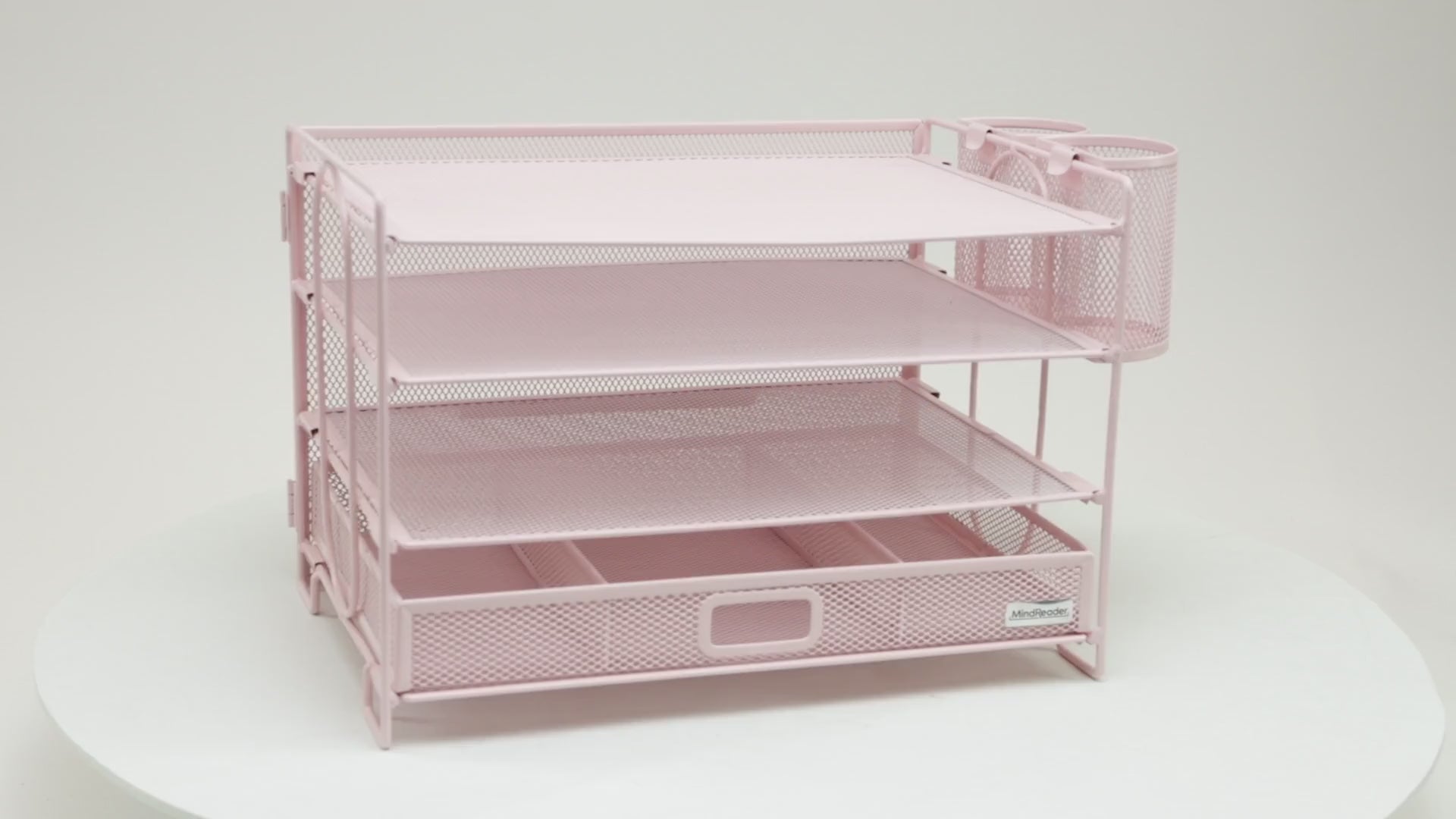 Streamline your desktop with this all-in-one mesh organizer from Mind Reader. Designed with three spacious horizontal trays, two integrated pen cups, and a pull-out drawer, this compact unit keeps paperwork, writing tools, and office supplies neatly stored and easily accessible. Its durable all-metal mesh construction adds a modern touch while withstanding daily use in busy office environments.