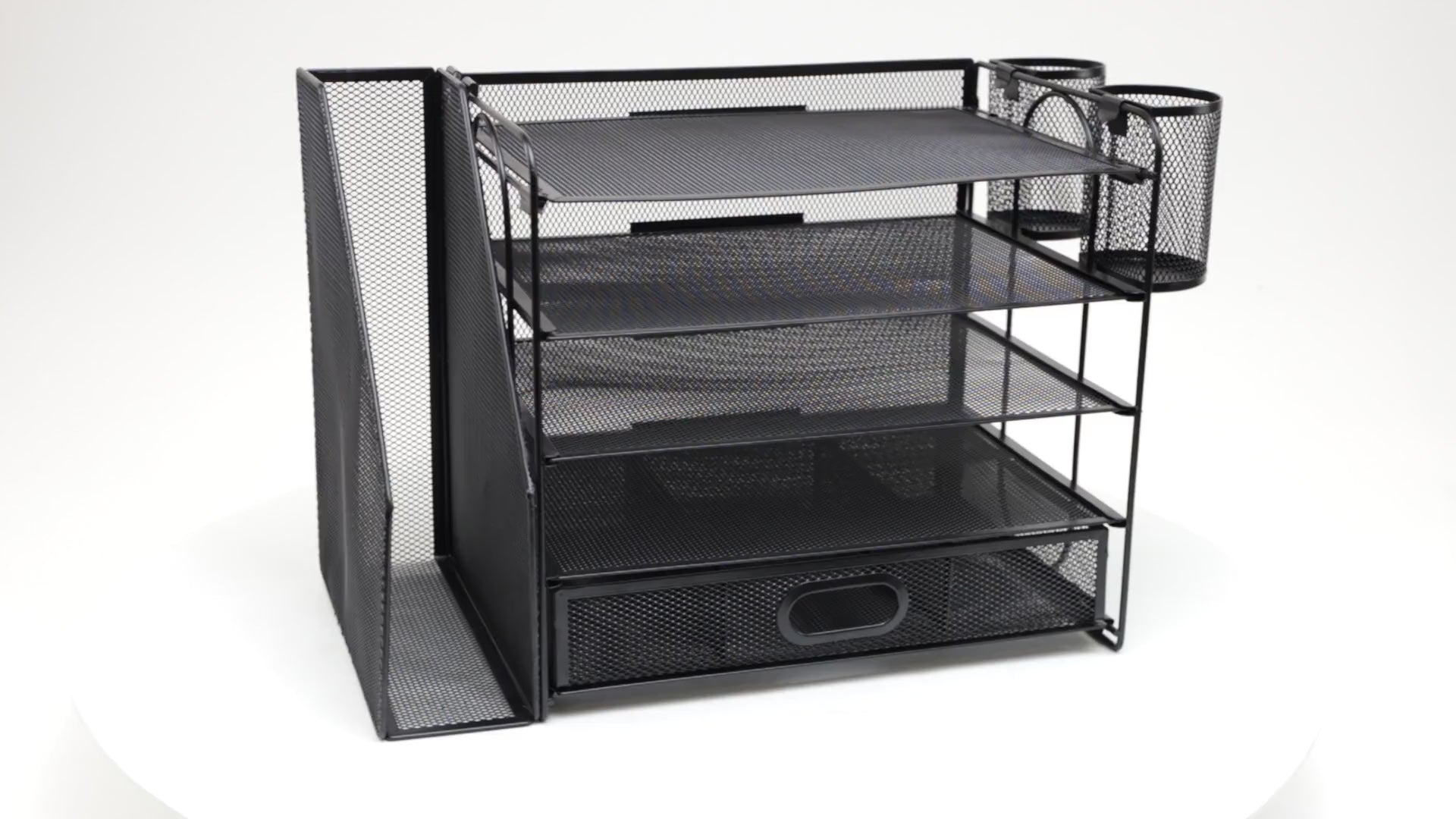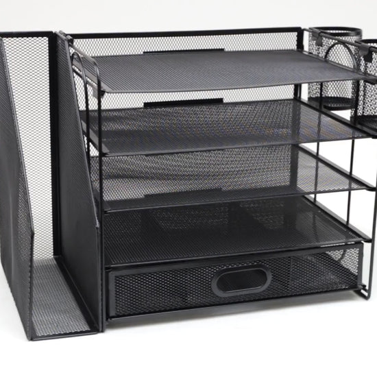 This all-in-one unit features four horizontal trays for documents, a pull-out drawer for smaller supplies, two integrated pen cups, and a vertical file holder for folders or notebooks. It's designed to keep your workspace tidy and efficient, whether at home or in a busy office. Durable metal mesh construction ensures long-term use, while the sleek black finish adds a professional touch to any setup.