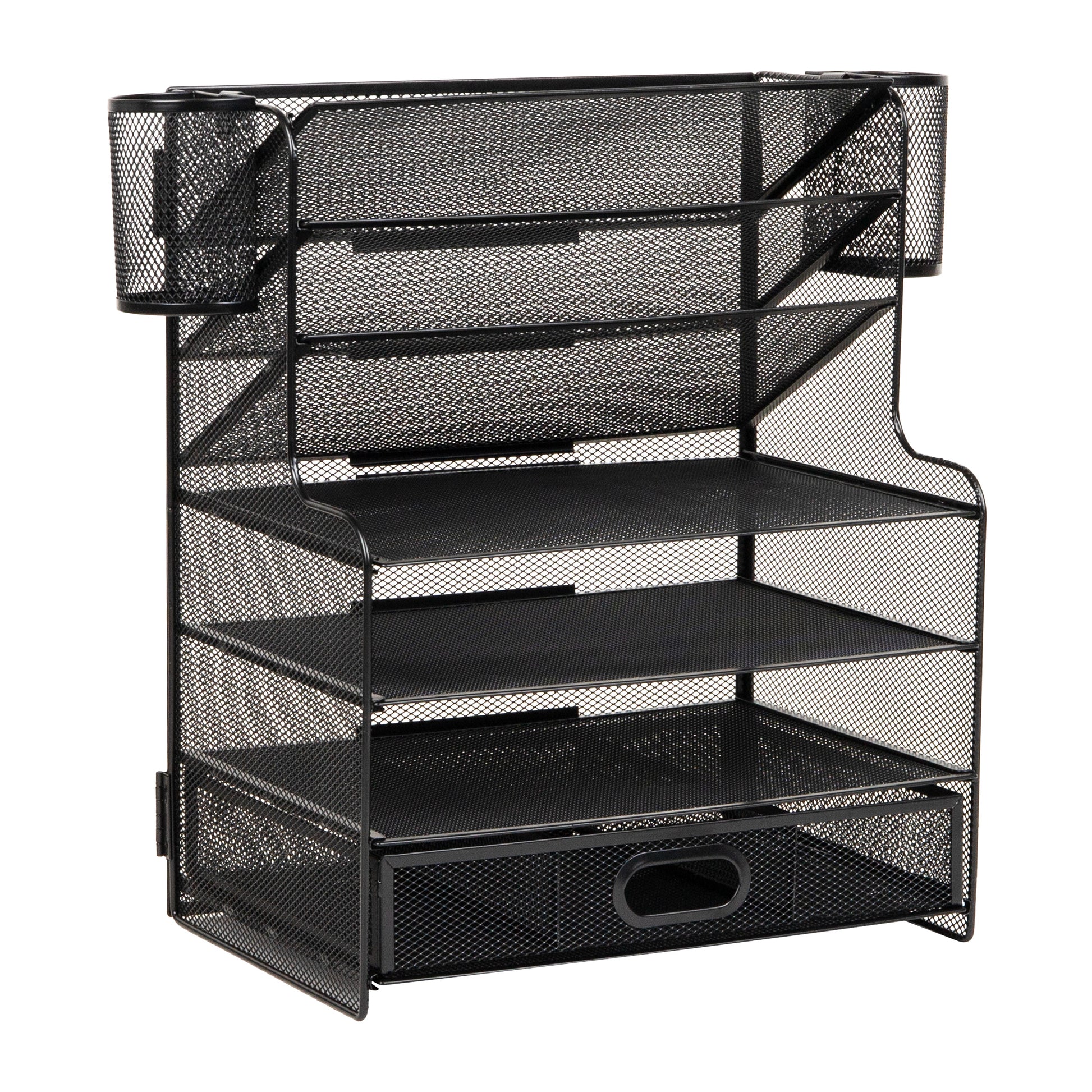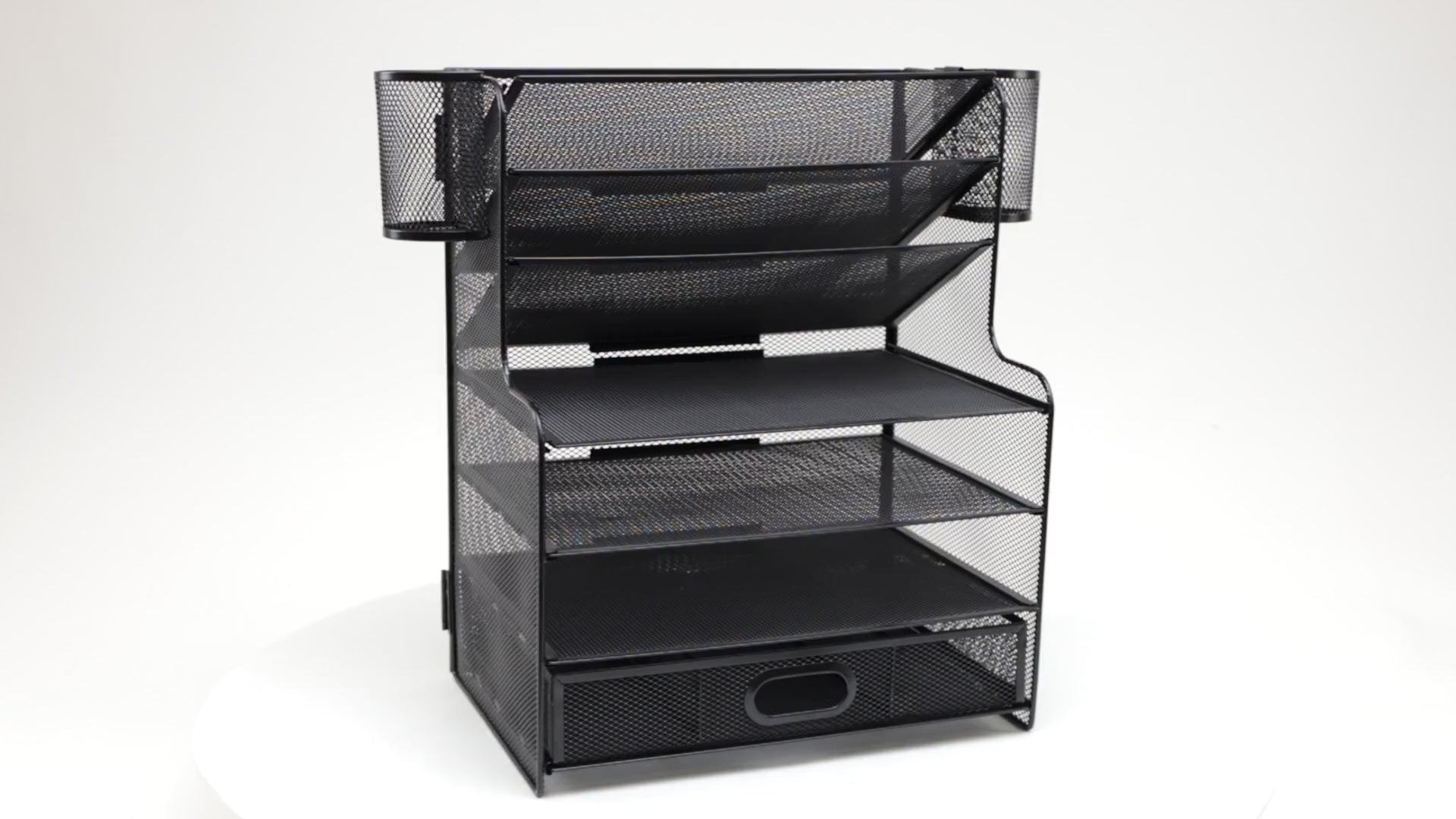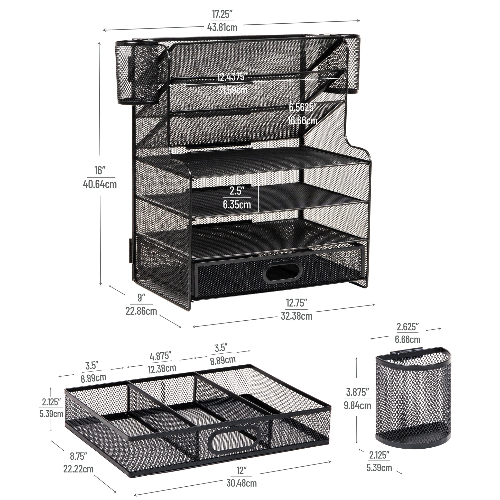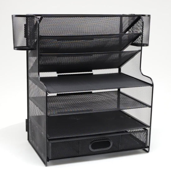 Featuring six compartments, two built-in pen cups, and a pull-out drawer, this organizer provides ample space for sorting files, mail, notepads, pens, and office supplies. Designed to sit neatly on your desktop, it helps eliminate clutter and maximize your productivity. The sturdy metal mesh construction adds a modern look while ensuring long-lasting durability. Perfect for office, home office, or school use, this versatile organizer keeps everything you need right at your fingertips.
