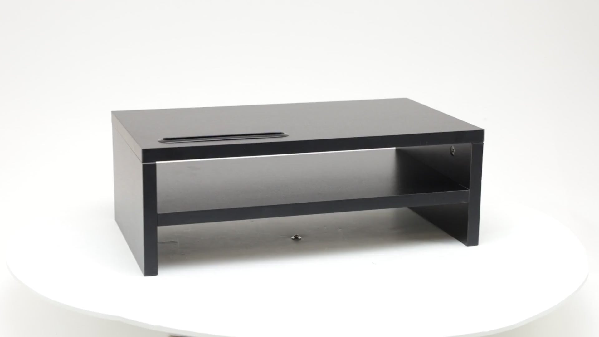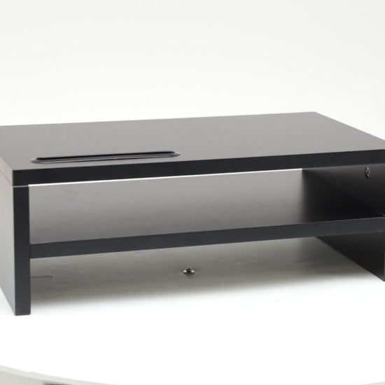 Upgrade your workstation with the Mind Reader Monitor Stand—a sleek black MDF riser with built-in phone slot and storage shelf for added convenience. Designed to raise your monitor to a more ergonomic height, this stand helps reduce neck and eye strain while improving posture and productivity.