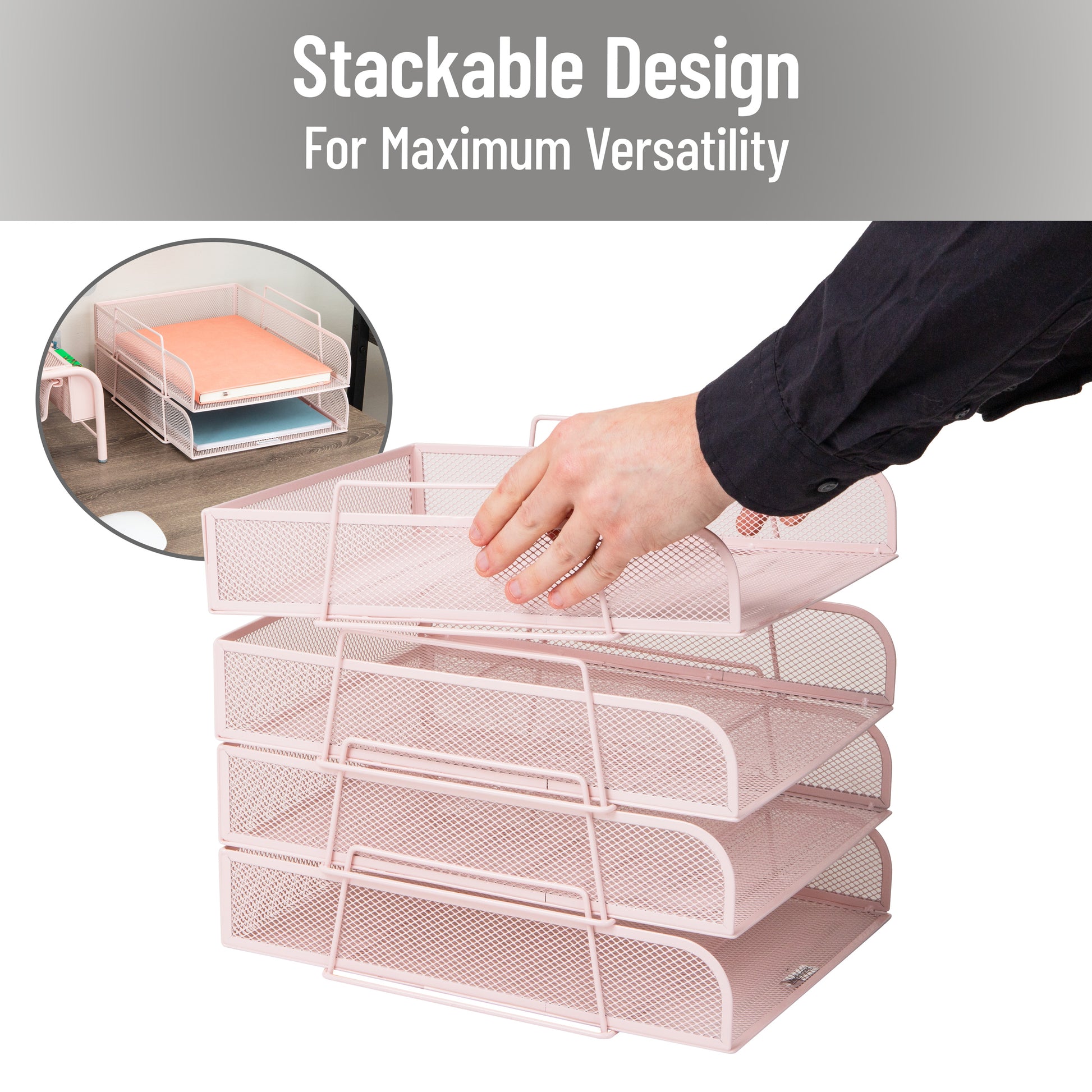 Boost your productivity with this four-tier, stackable desktop organizer. Designed for letter-size papers, folders, and files, this organizer lets you keep your essential documents within arm's reach. The trays can be stacked, placed separately on your desk for diverse storage, or used in different locations - like your office and home. Weighing a combined 3.3 pounds (1.5 kg), each piece is lightweight, portable, and easy to handle.