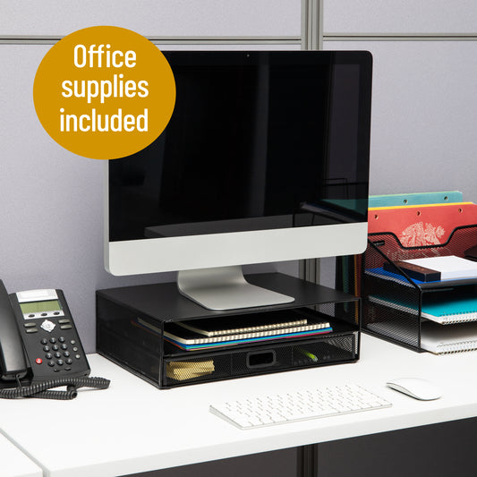Mind Reader New Employee Starter Kit, Monitor Stand and 25 Pc. Office Supply, Storage, Metal Mesh, 15.75"L x 11.75"W x 4.5"H, Black