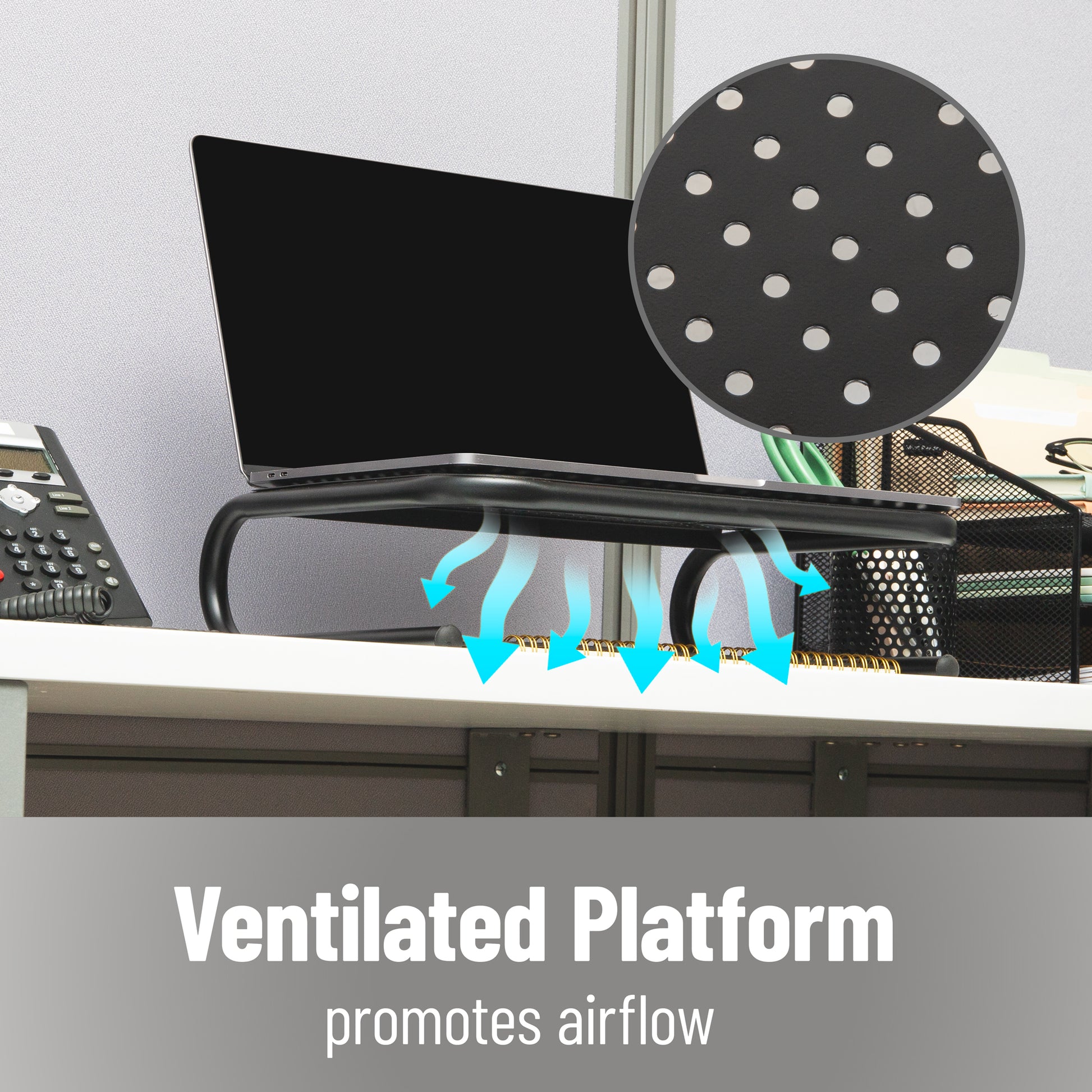 A ventilated design allows devices such as your laptop to breathe so they're not in danger of overheating. Non-slip feet ensure your stand and devices stay in place. The extra added height of the monitor stand can help reduce stress on your neck and back, as you're no longer crouching over to a monitor that’s not at eye level.
