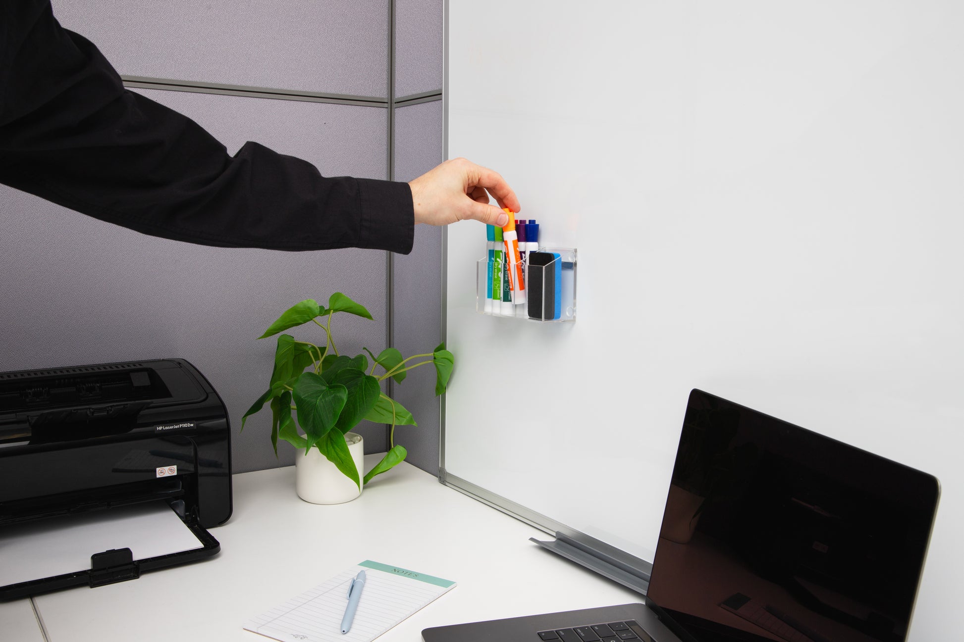 Two built-in magnets on the back allow the organizer to securely attach to any magnetic whiteboard, while four non-slip pads help hold it firmly in place. Use it vertically on a whiteboard or place it flat on a desk as a multi-purpose pen and accessory holder.