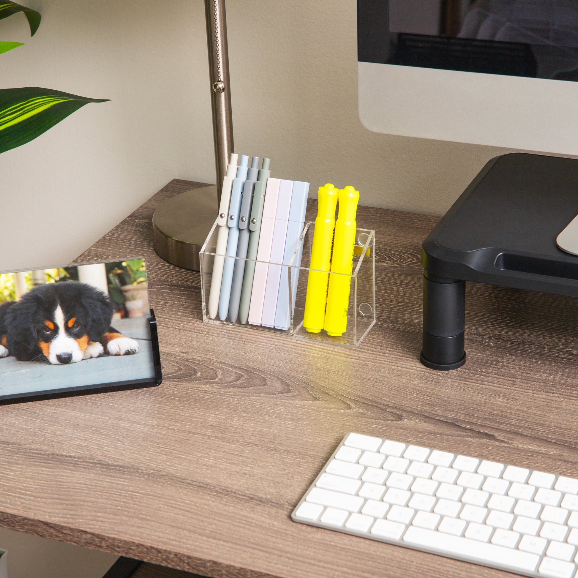 Measuring 5.75 inches wide by 2 inches deep by 3.5 inches high, this dual-compartment holder provides a 3.1875-inch wide section for markers and a 2.1875-inch wide section for an eraser or accessories. Its transparent acrylic construction makes it easy to view contents at a glance while keeping your space tidy and organized.