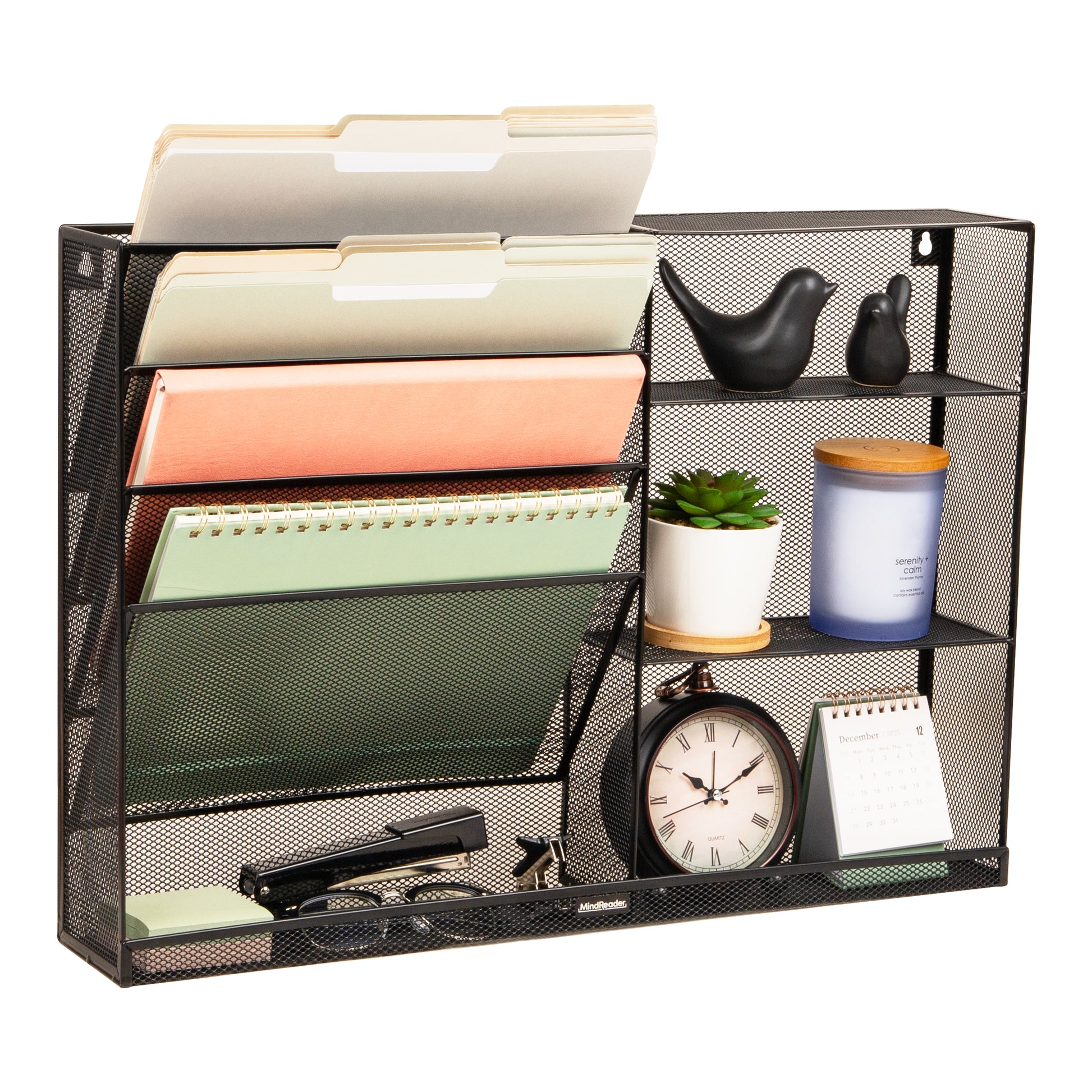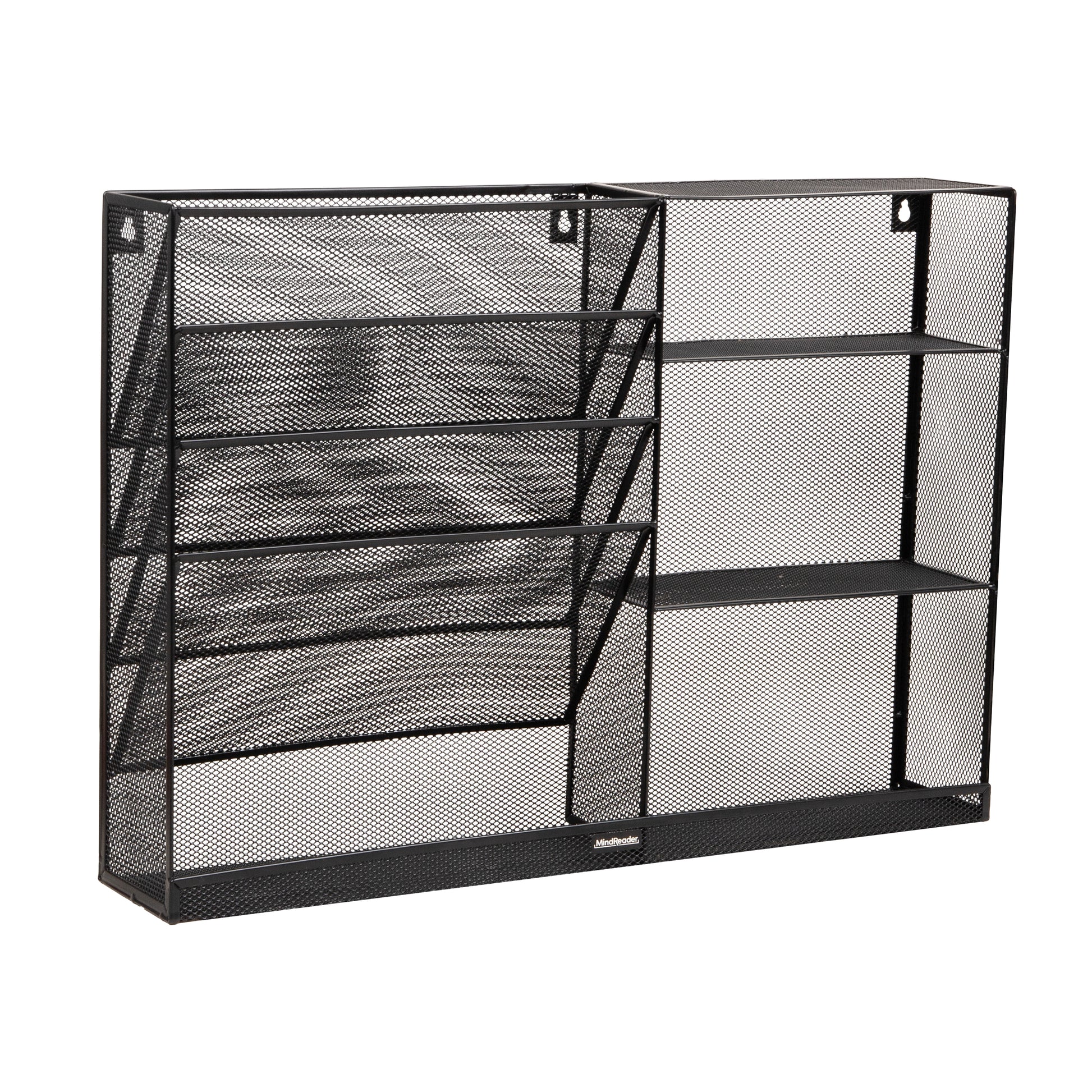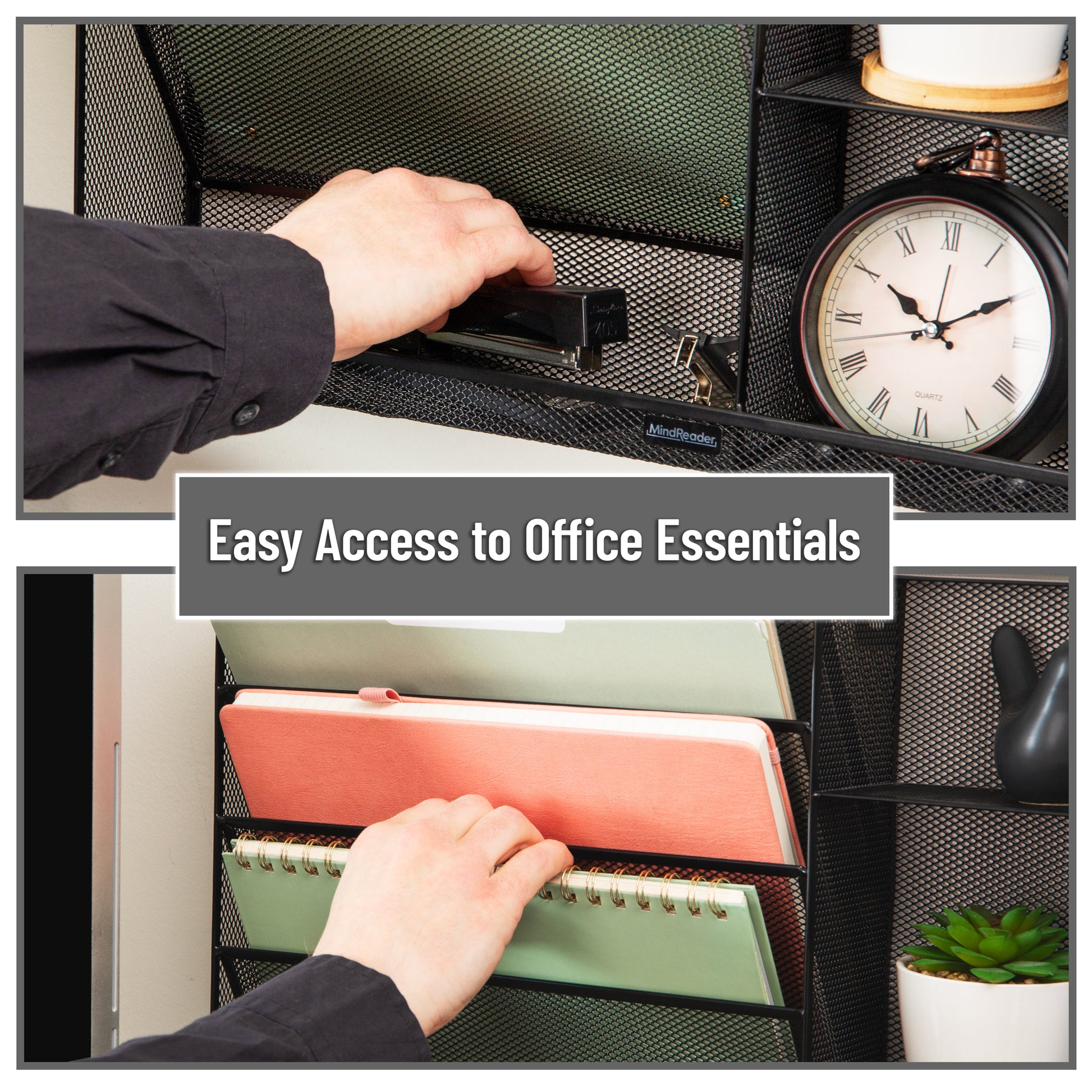 Mind Reader 4-Tier Vertical File Storage and Shelves, Desktop Organizer, Wall Mount, Office, Metal Mesh, 22.5"L x 4"W x 16"H, Black