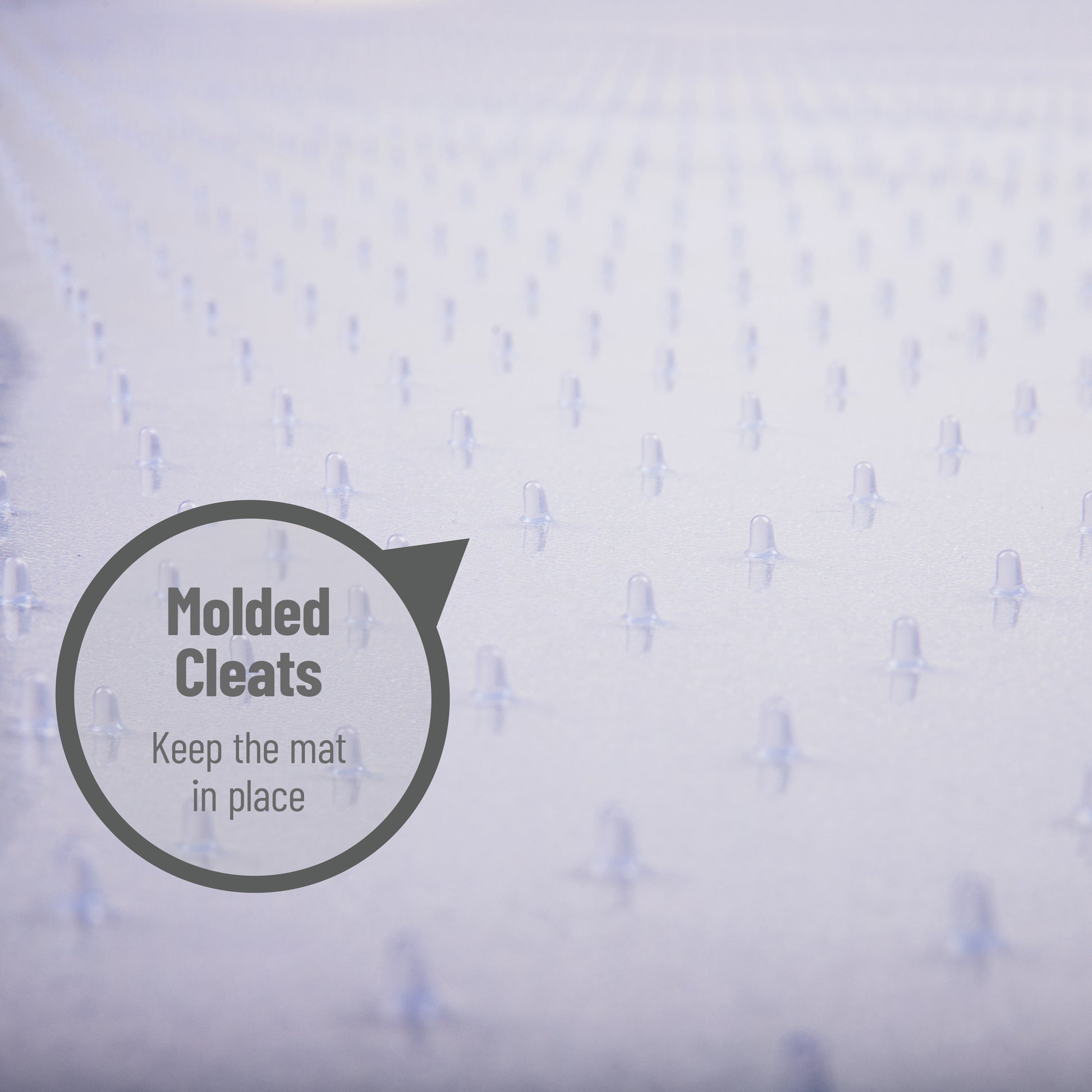 This PVC floor mat keeps you mobile and provides you the comfort you need while working. It works best on low pile carpeting and has molded cleats to keep it in place. The mat is made from pliable PVC so this rugged office mat is less likely to tear or break. Avoid constantly replacing thin, torn-up, cracked computer mats. To clean your office mat, simply wipe with a soft cloth using mild soap and water. This mat ships flat and there's no assembly required.
