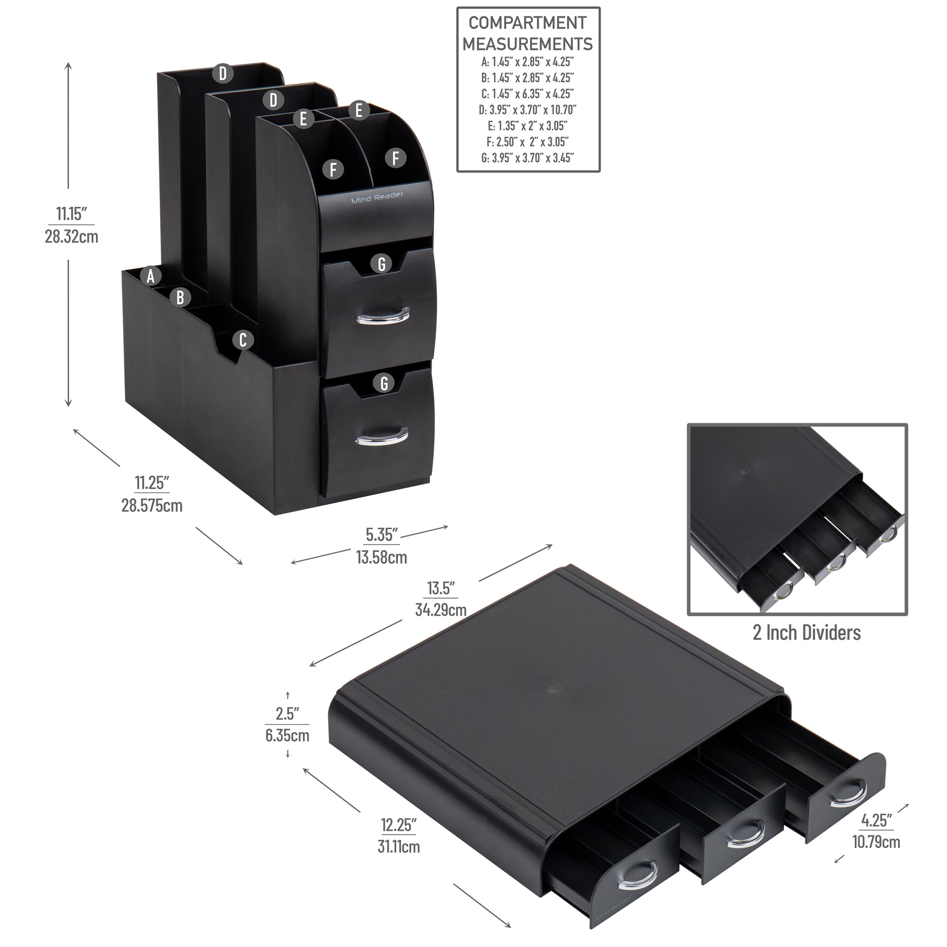 - Dimensions: The compact pod drawer measures 13.5 long x 12.8 wide x 2.7 inches tall (34.29 x 32.51 x 6.85 centimeters), and the coffee condiment caddy measures 12 long x 5.4 wide x 11 inches tall (30.48 x 13.71 x 27.94 centimeters)