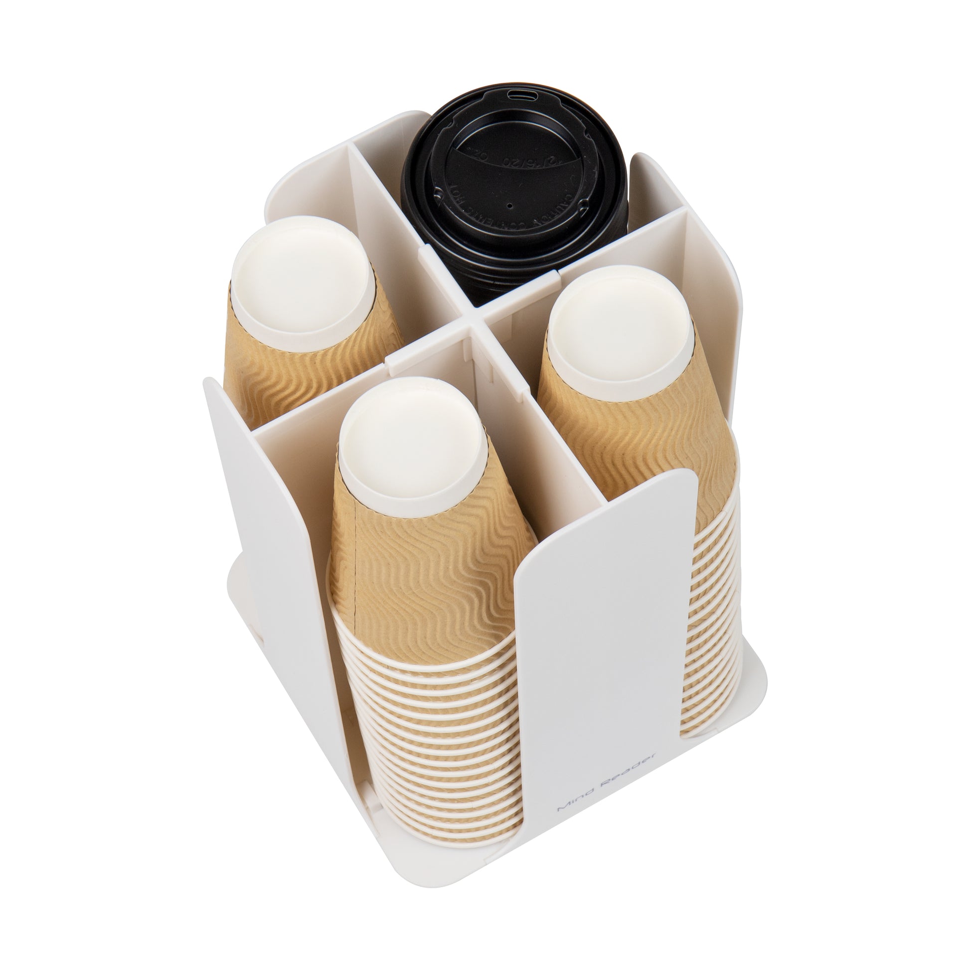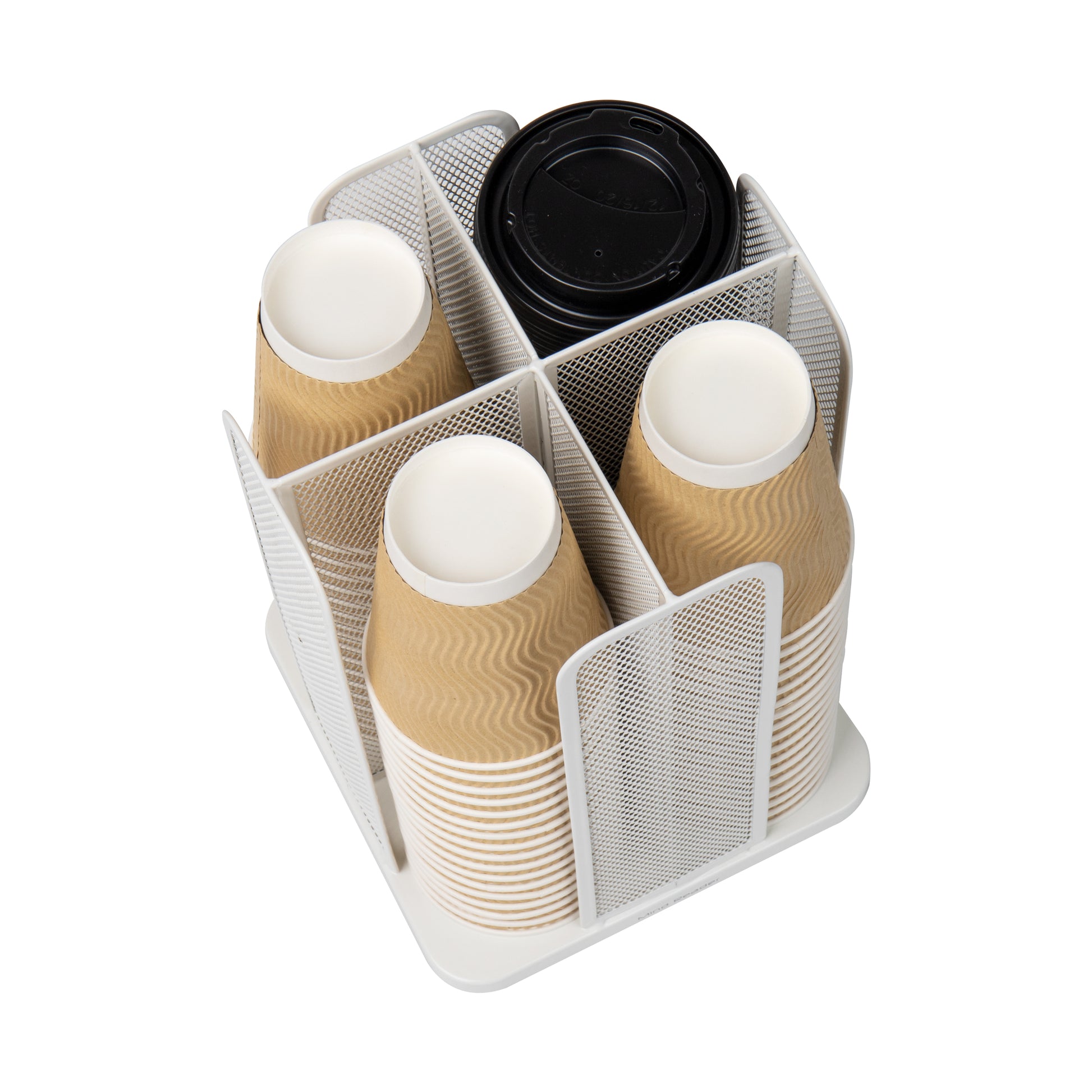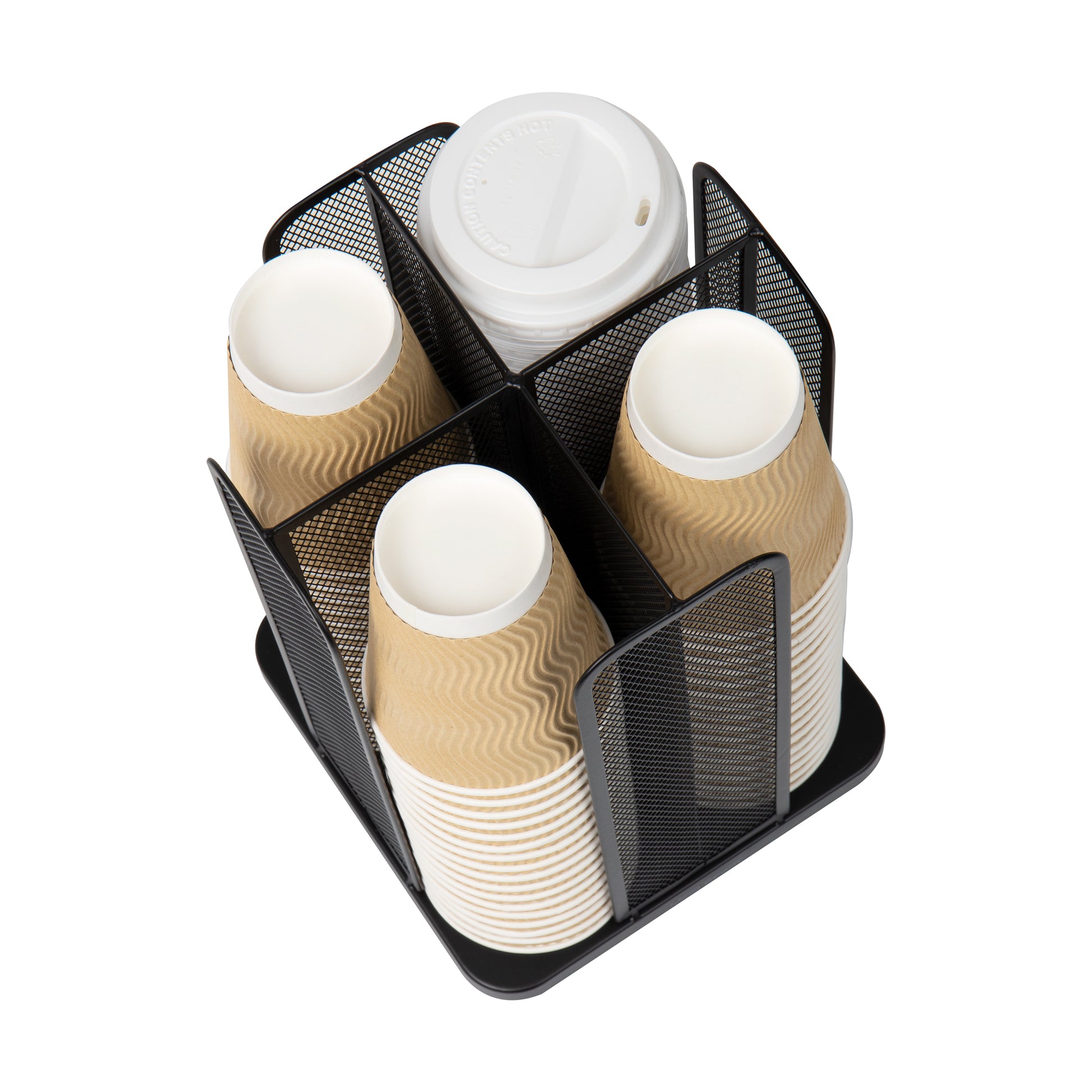 Organization is essential in any kitchen, especially in the workplace or hotel. Keep your lids and disposable cups neat and tidy on any countertop with this 4-compartment carousel. Each compartment can hold 25-30 cups depending on the size. It fits 10-,12- and 16-ounce disposable cups and lids easily.