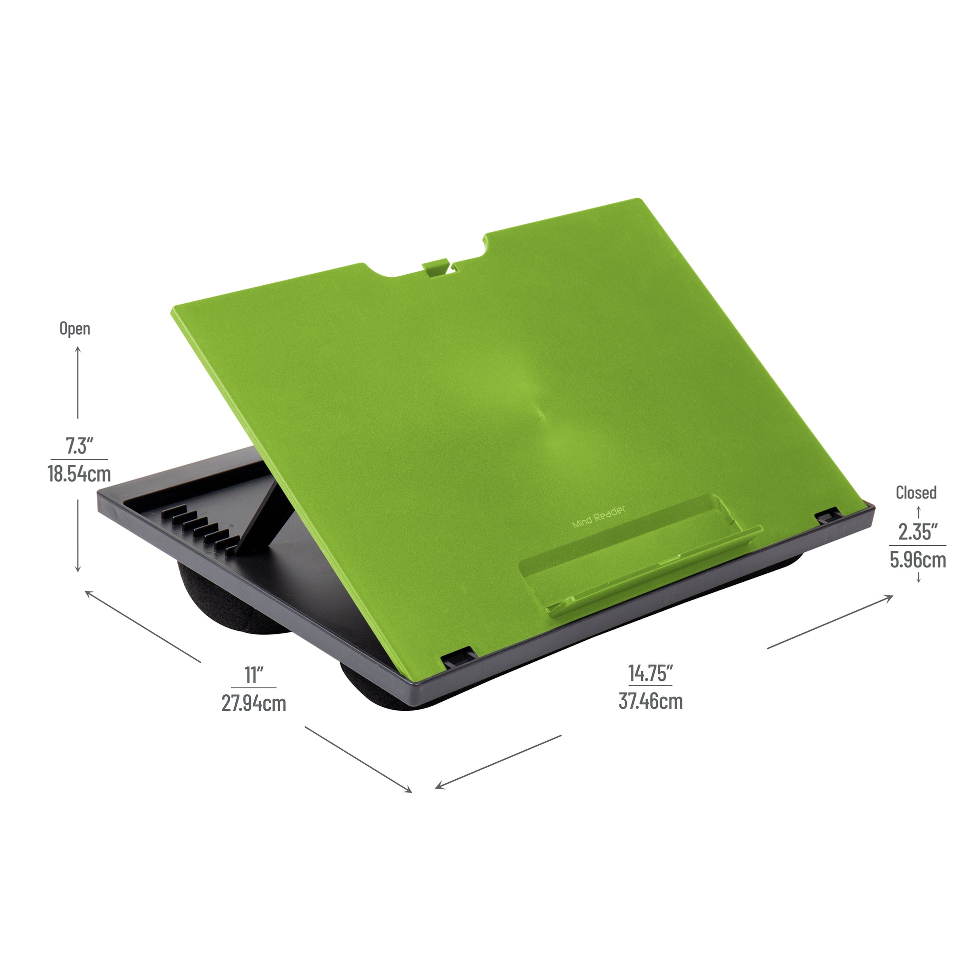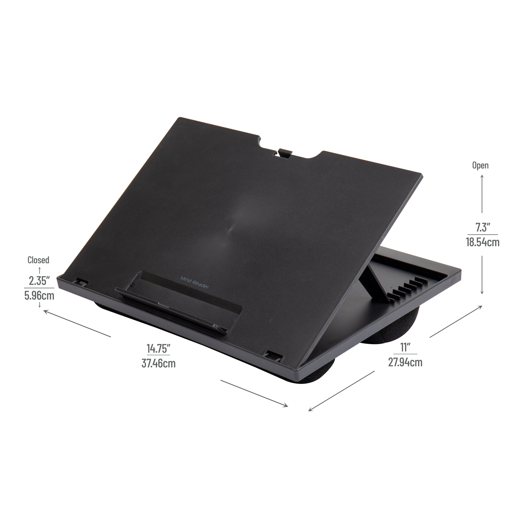 - Dimensions: The laptop desk measures 14.75 long x 11 wide x 2.3 inches tall closed and 7.3 tall when open (37.47 x 27.94 x 5.84 centimeters closed, 18.54 open) and weighs 3.69 lbs (1.67 kilograms)