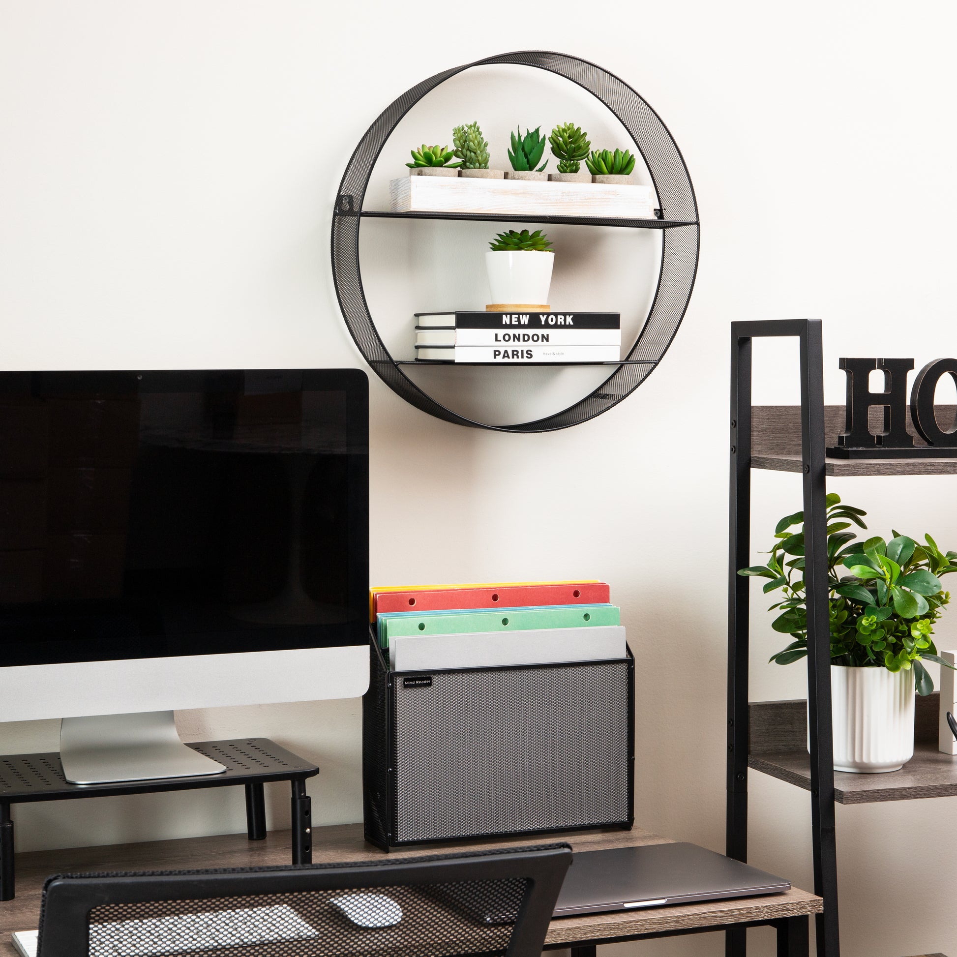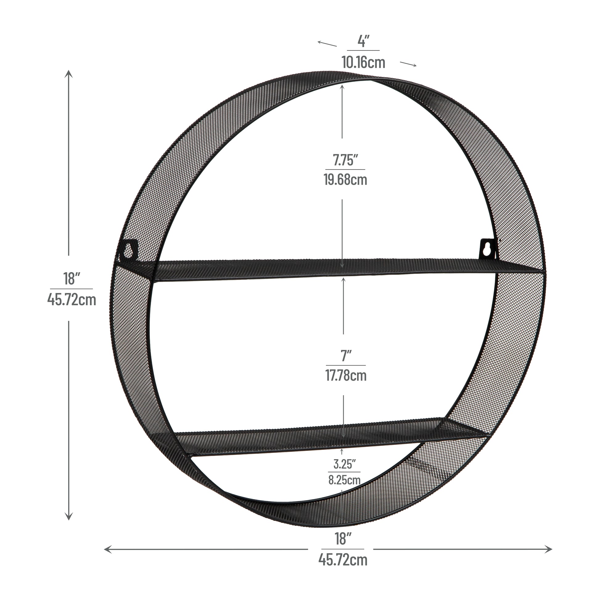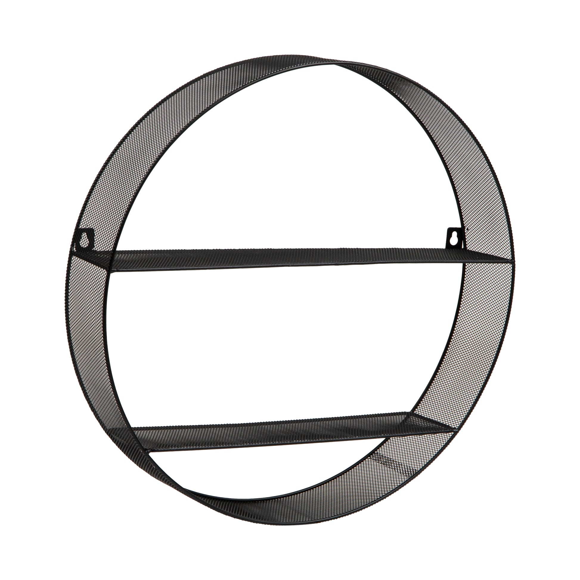 - Stylish Round Wall Shelves: This round wall shelf features a black metal mesh frame with two shelves. It's perfect for displaying books, photo frames, or decorative items. Equipped with round metal eyelets for secure wall mounting