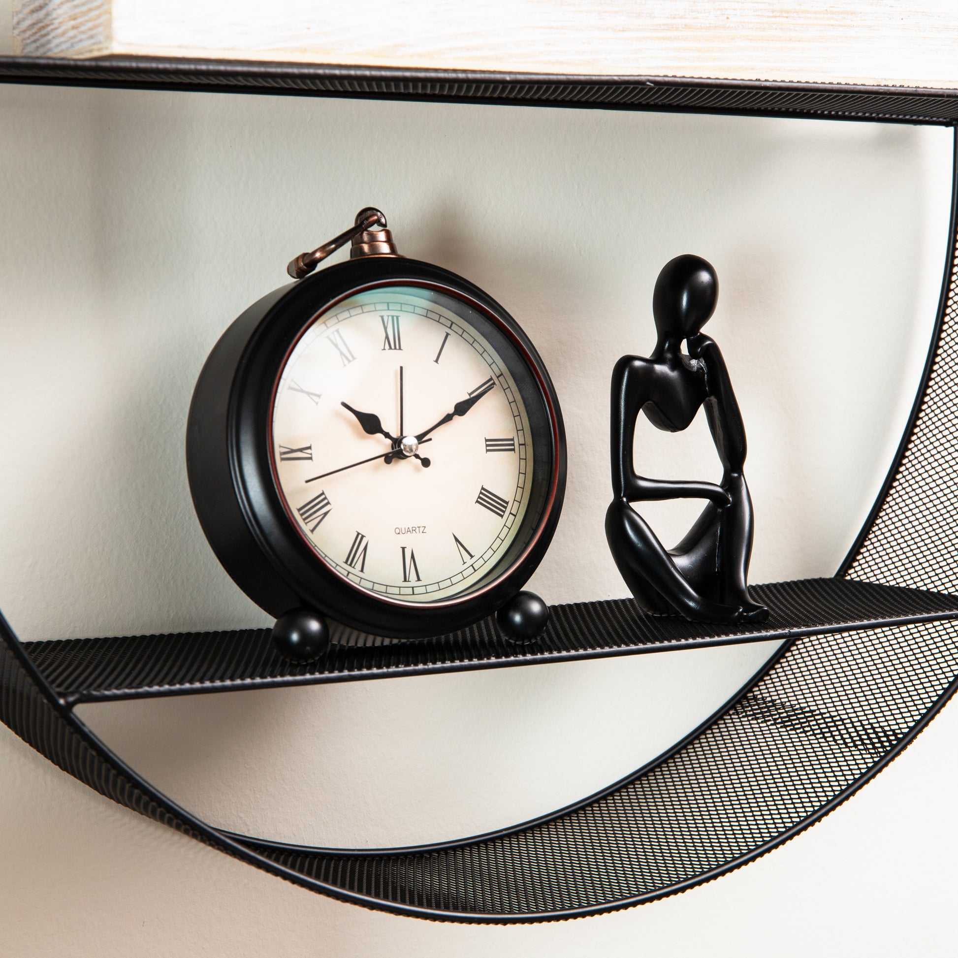 Combine functionality and elegance with these floating round wall shelves, designed to blend traditional and contemporary aesthetics. Featuring a black metal mesh frame and two sturdy shelves, this piece is ideal for displaying books, photo frames, or decorative accents. Whether in your home office, living room, or bathroom, the shelf adds a refined touch to any setting.