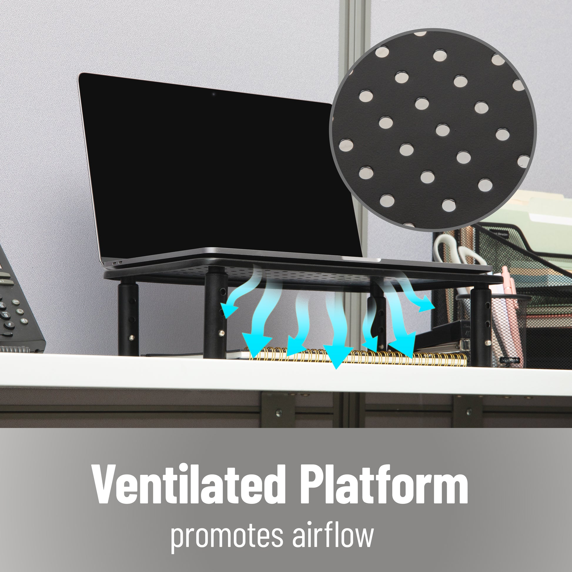 - Ventilated Platform: Breathable metal mesh surface promotes airflow to keep electronics cool during extended use