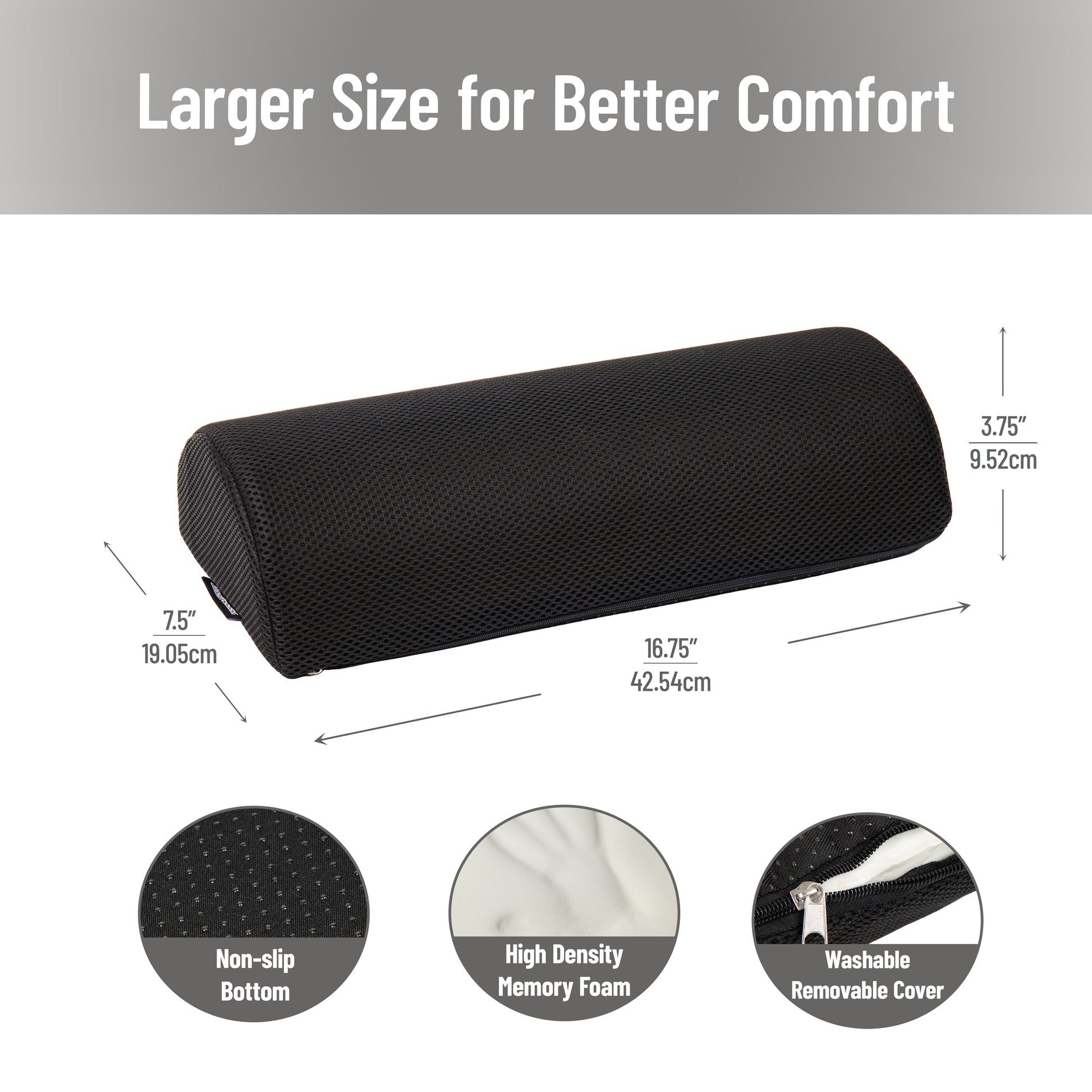 - Dimensions: The portable foam foot cushion measures 7.5 long x 16.75 wide x 3.75 tall (19.05 x 42.55 x 9.53 centimeters)