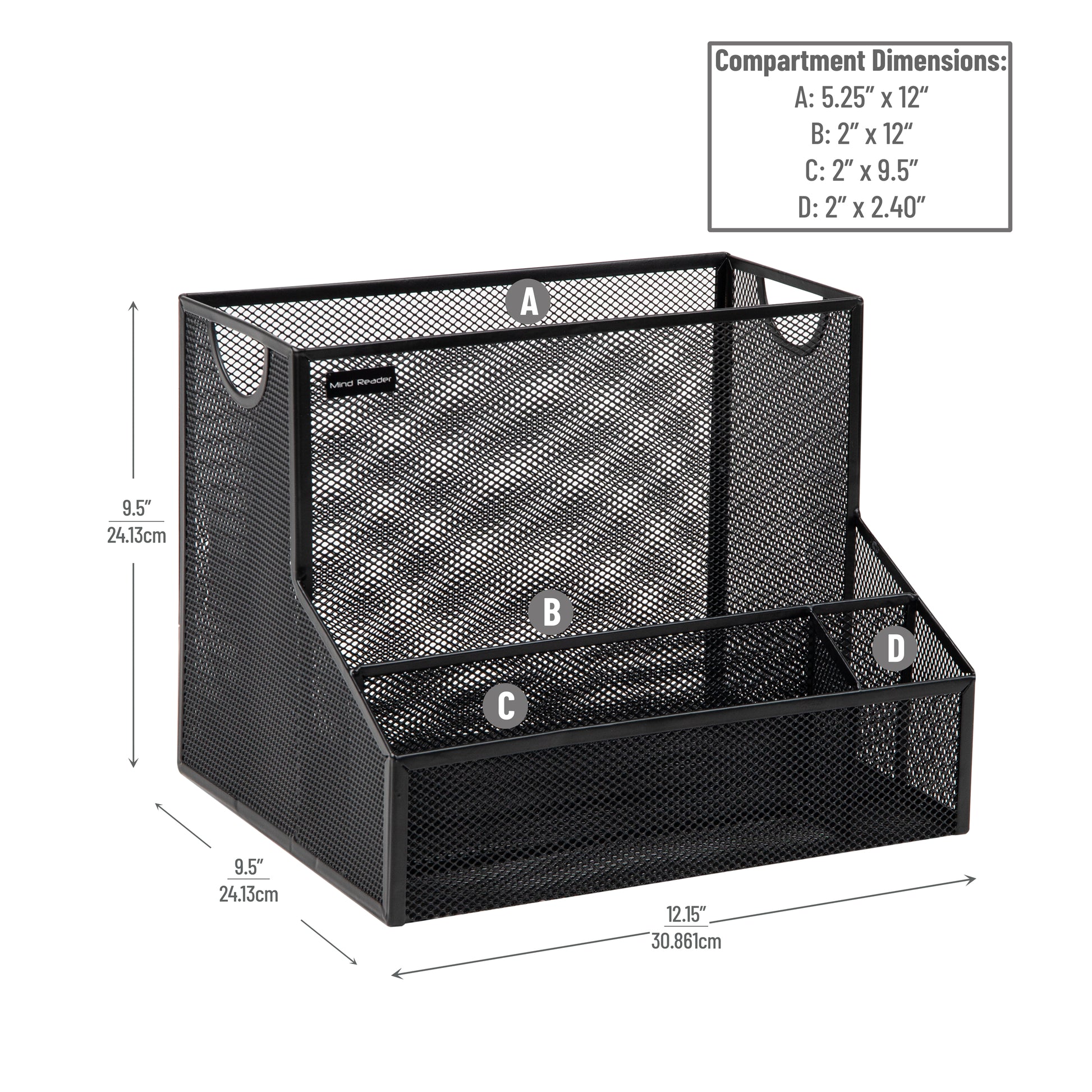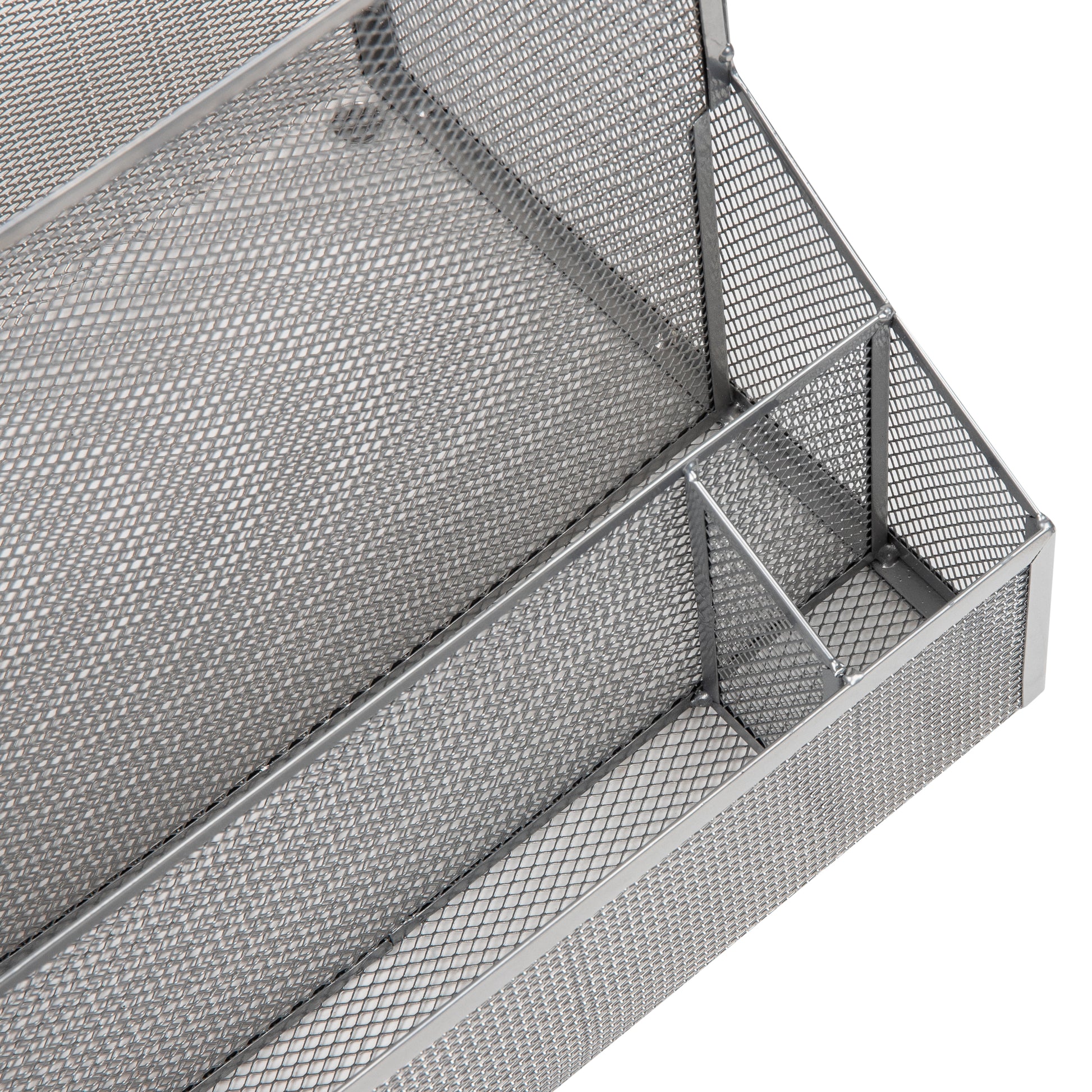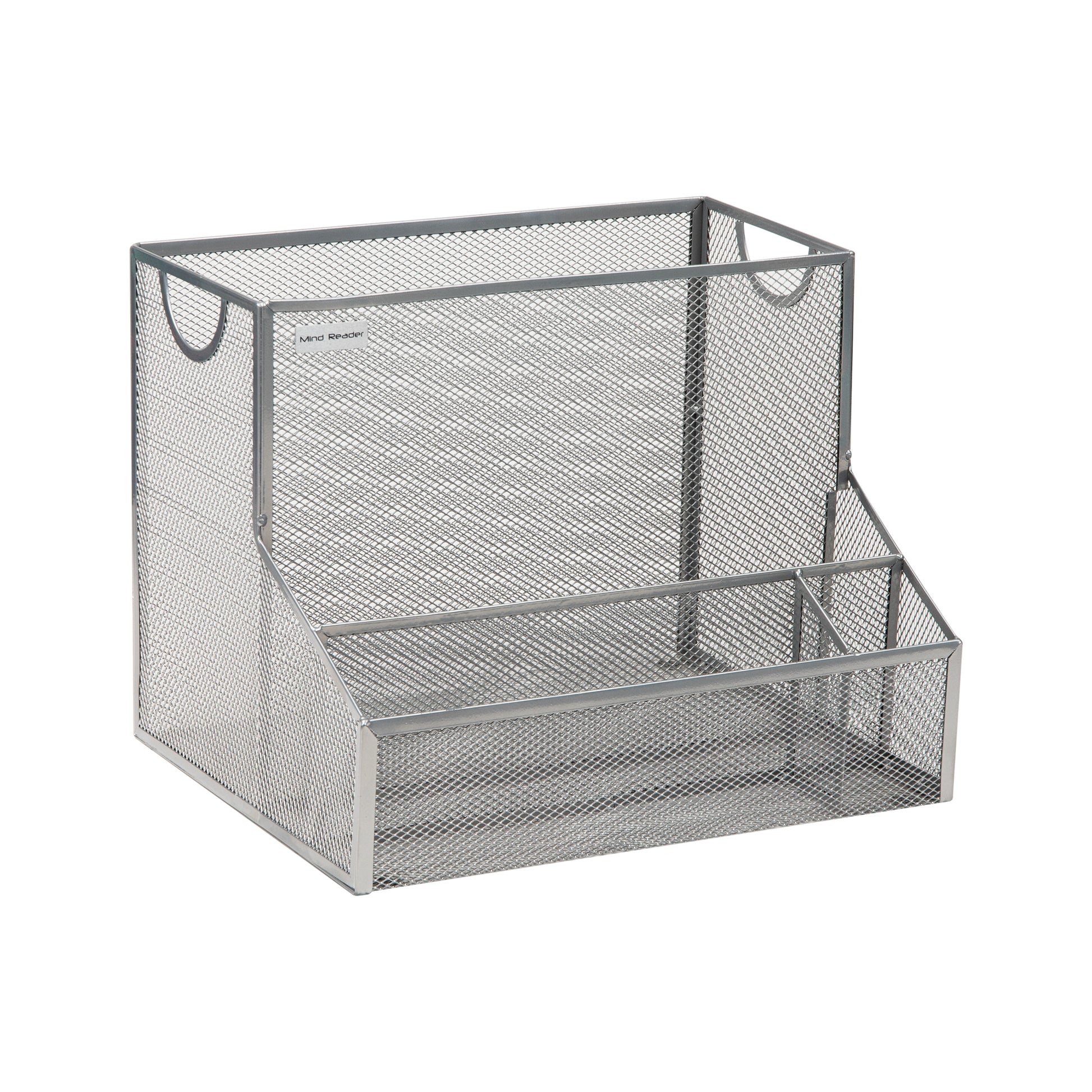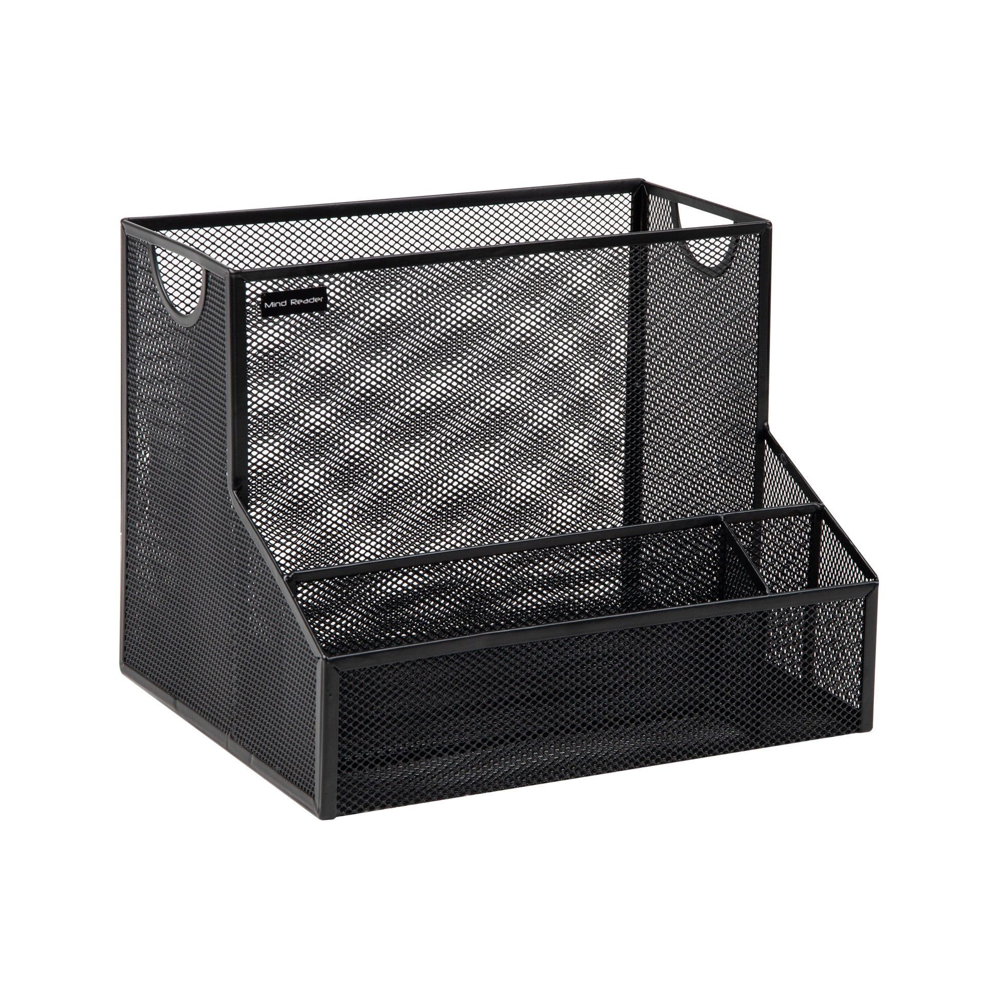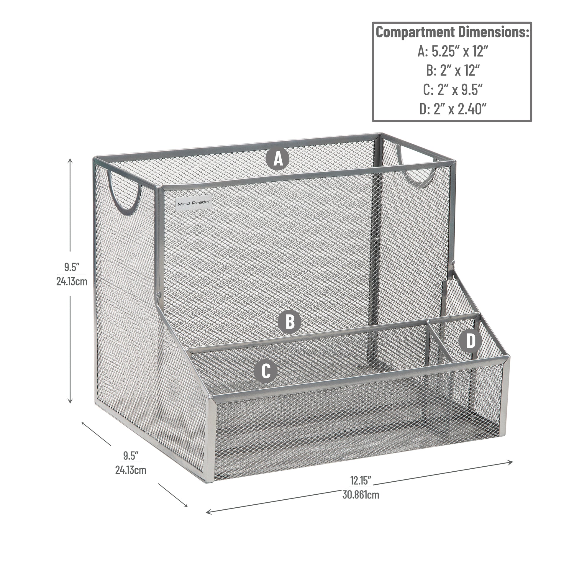 Constructed from durable metal mesh, this organizer can be easily cleaned with mild soap and a cloth for daily use. Weighing less than a pound, it's portable, allowing you to move it from your home office to your kitchen with ease. Measuring 12.15 inches long, 9.5 inches wide, and 9.5 inches tall, the small front compartments can be used for organizing pens, notepads, and electronic devices.