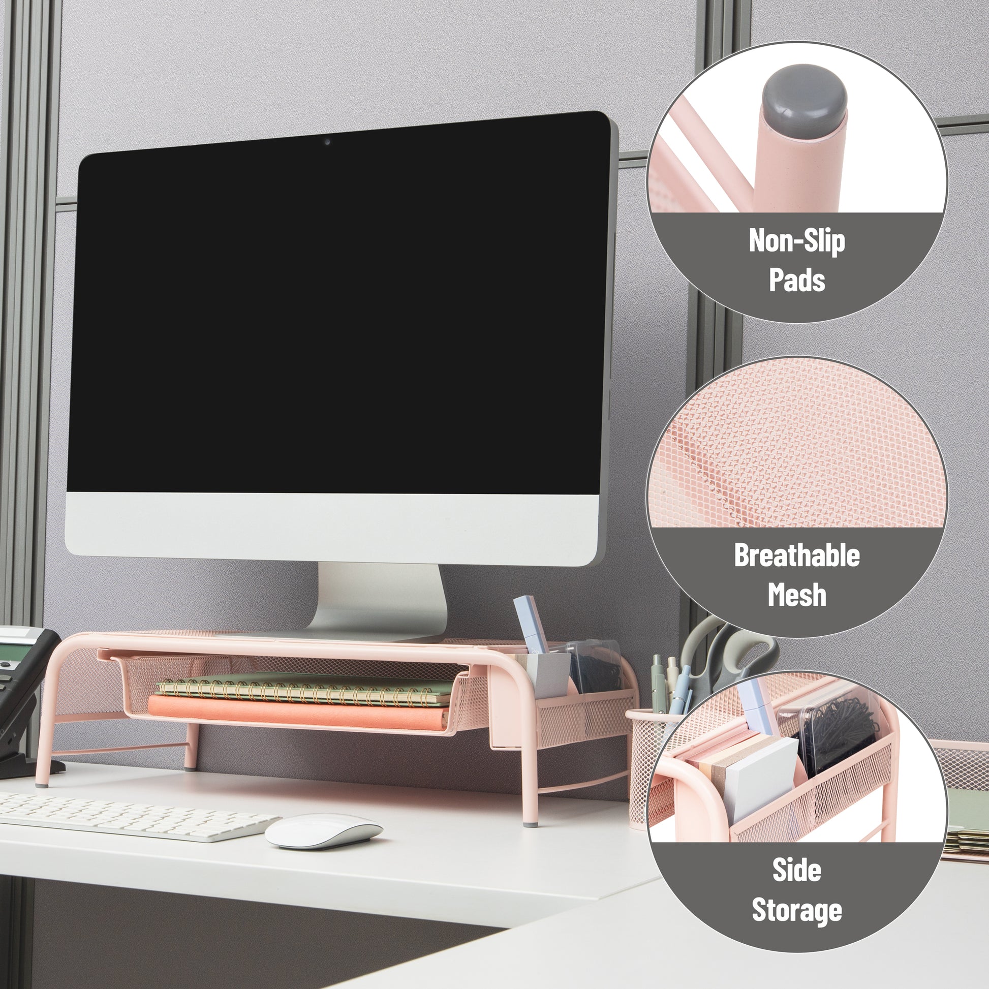 Constructed from sturdy mesh metal, this stand can comfortably support the weight of most standard monitors and laptops. To prevent slipping, the monitor stand's feet have rubber grips for added stability.