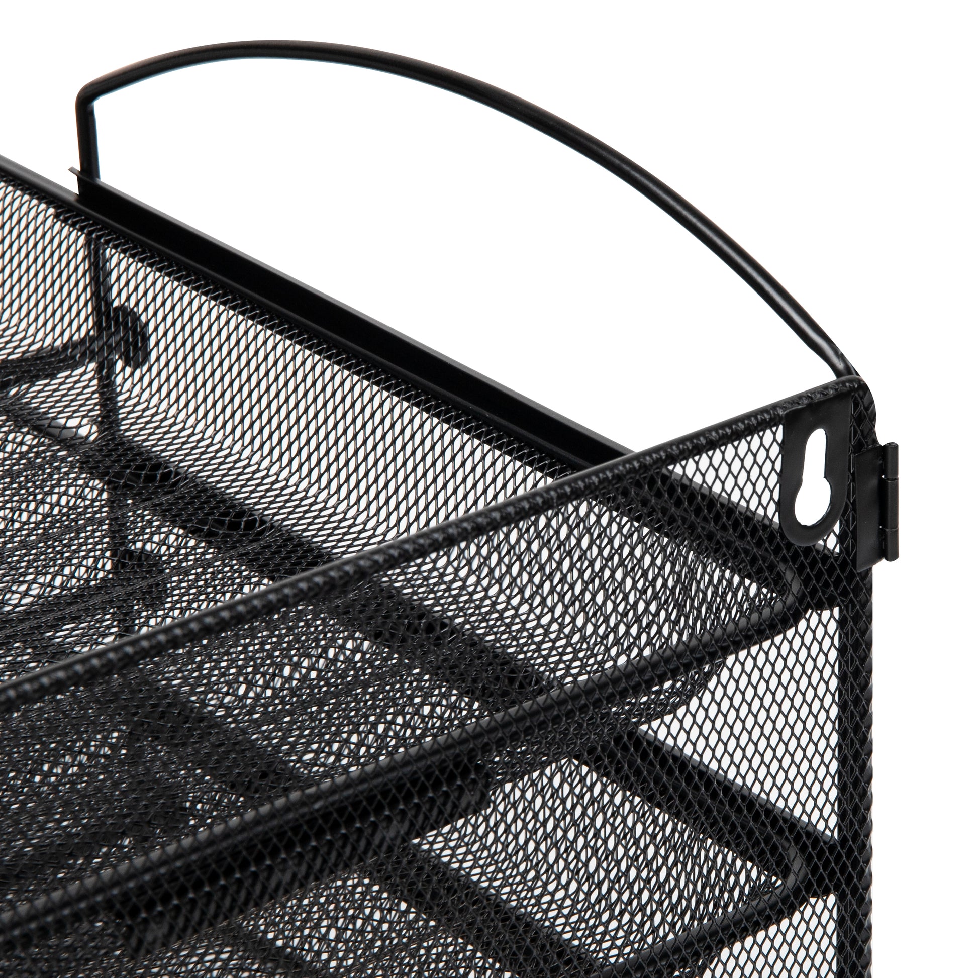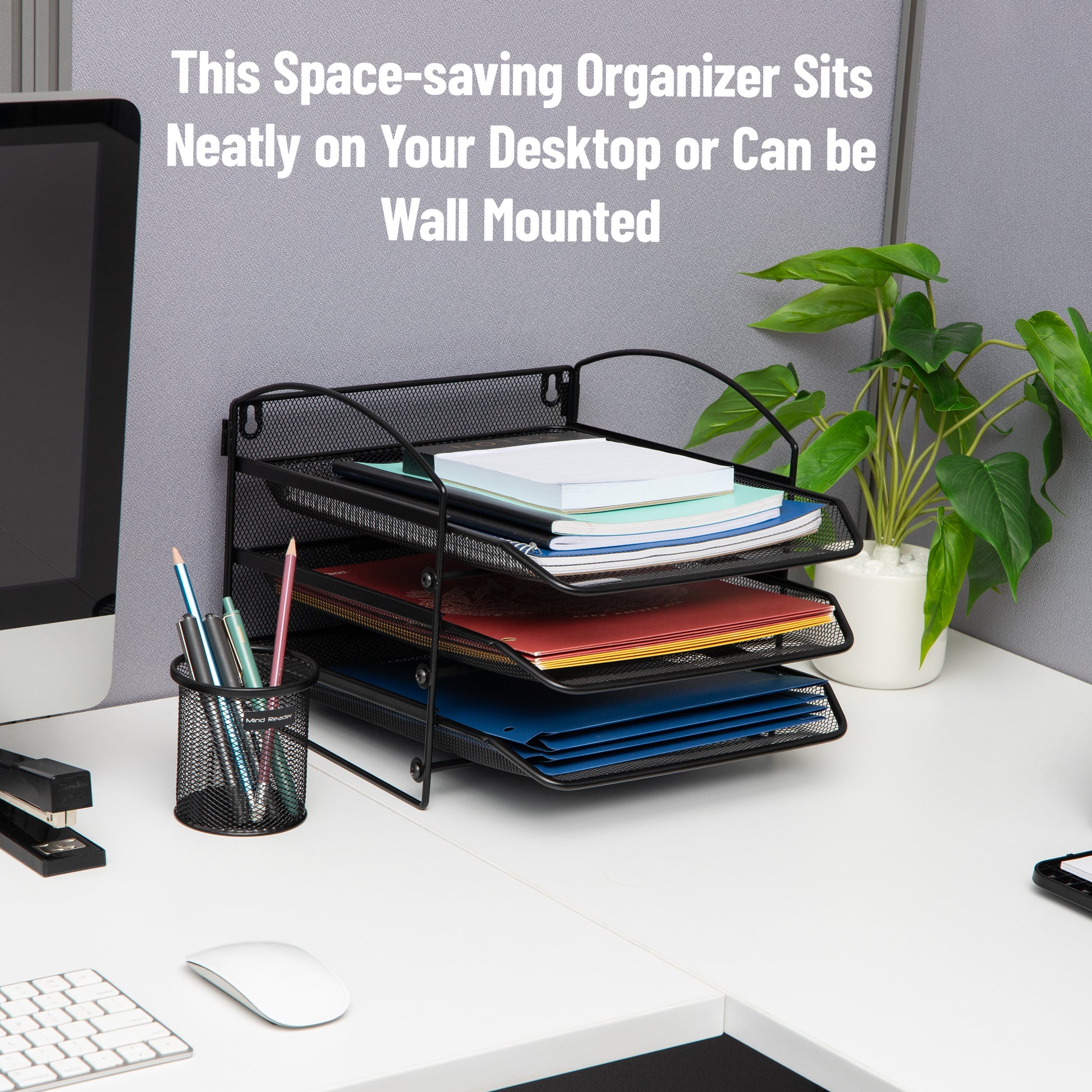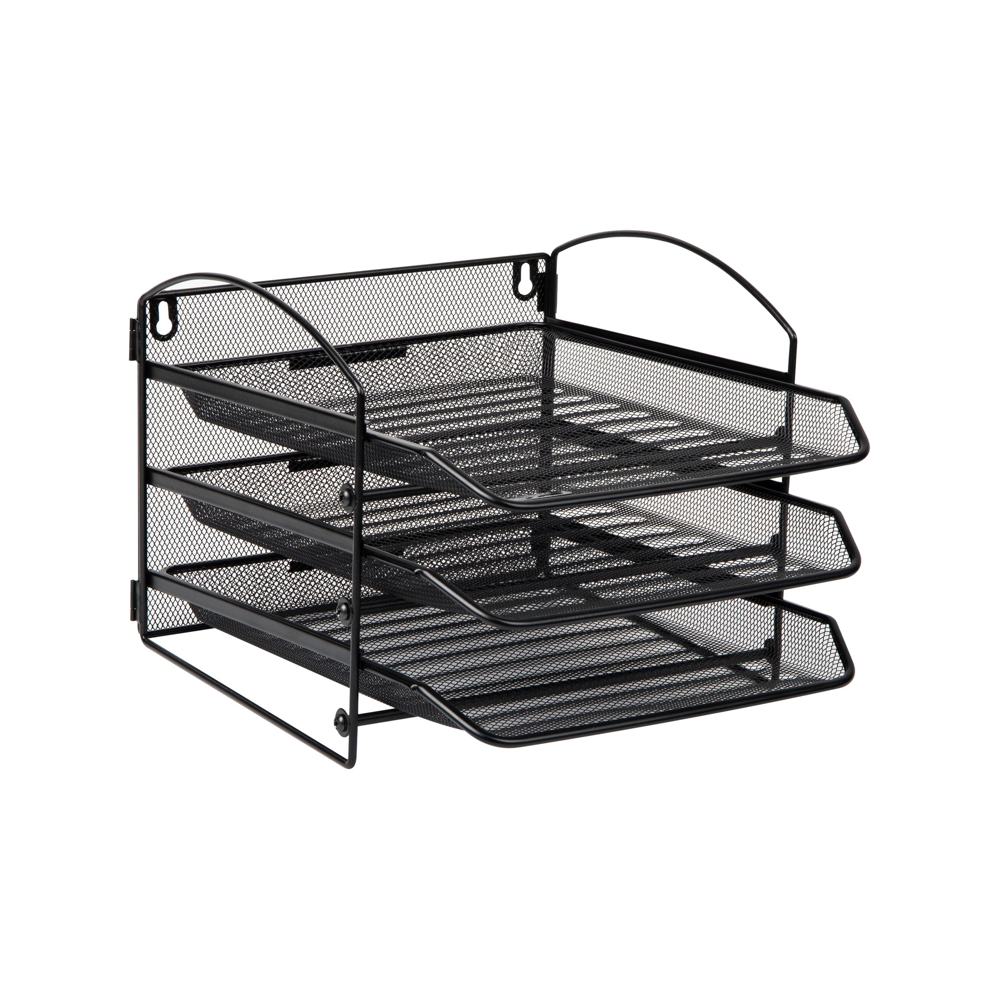 Keep your work-at-home or office space clear of clutter and stacks of papers with this tiered metal mesh organizer. It is wall mountable or can sit on your desktop. You can store needed items such as files and documents, retrieving important things immediately. Its sleek design and black color compliments any existing office and desk decor.