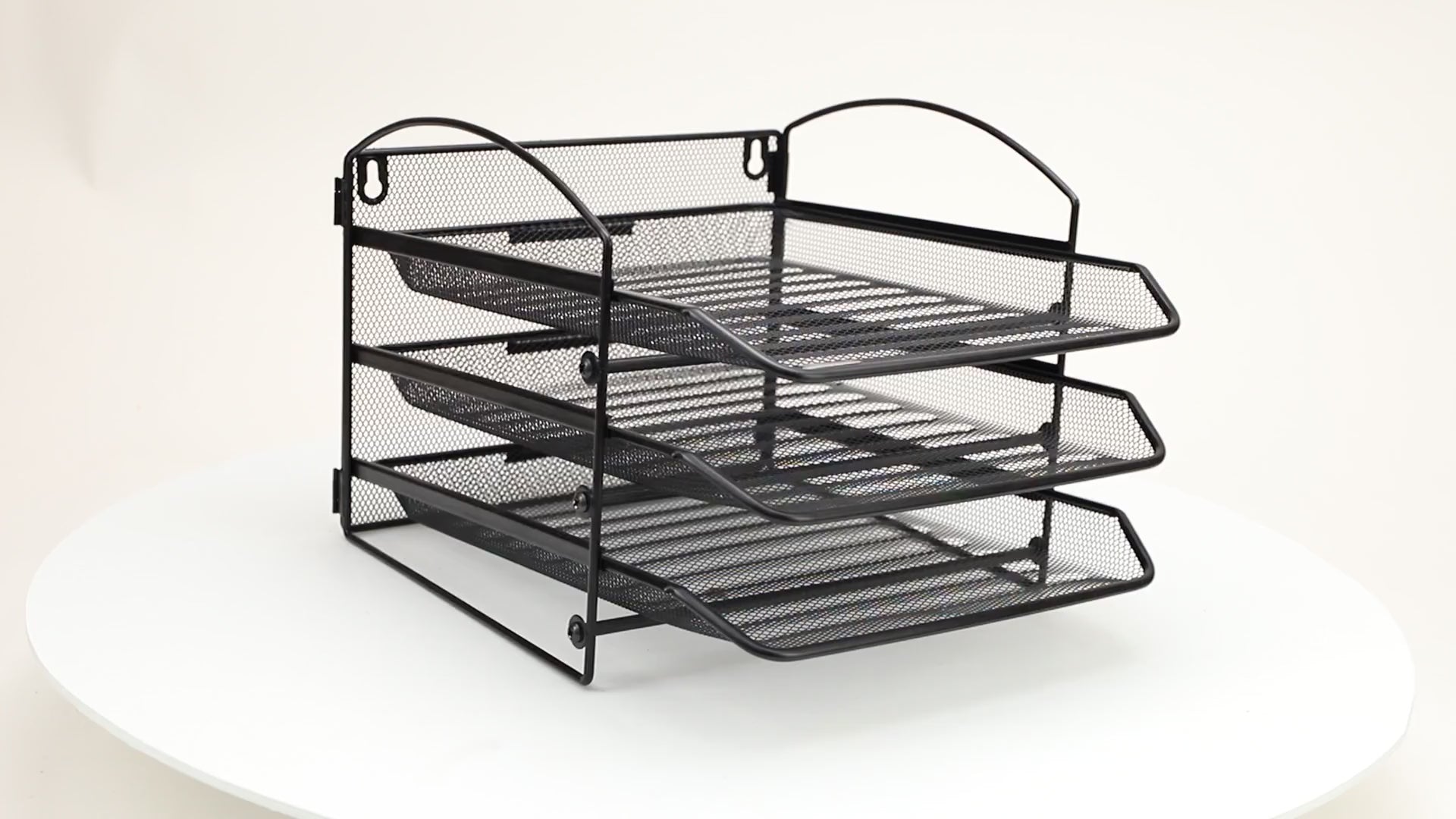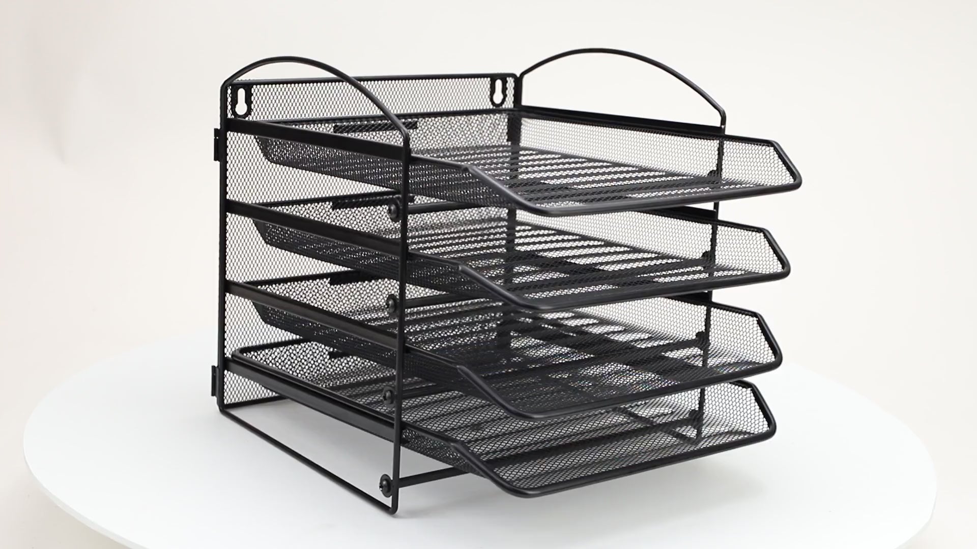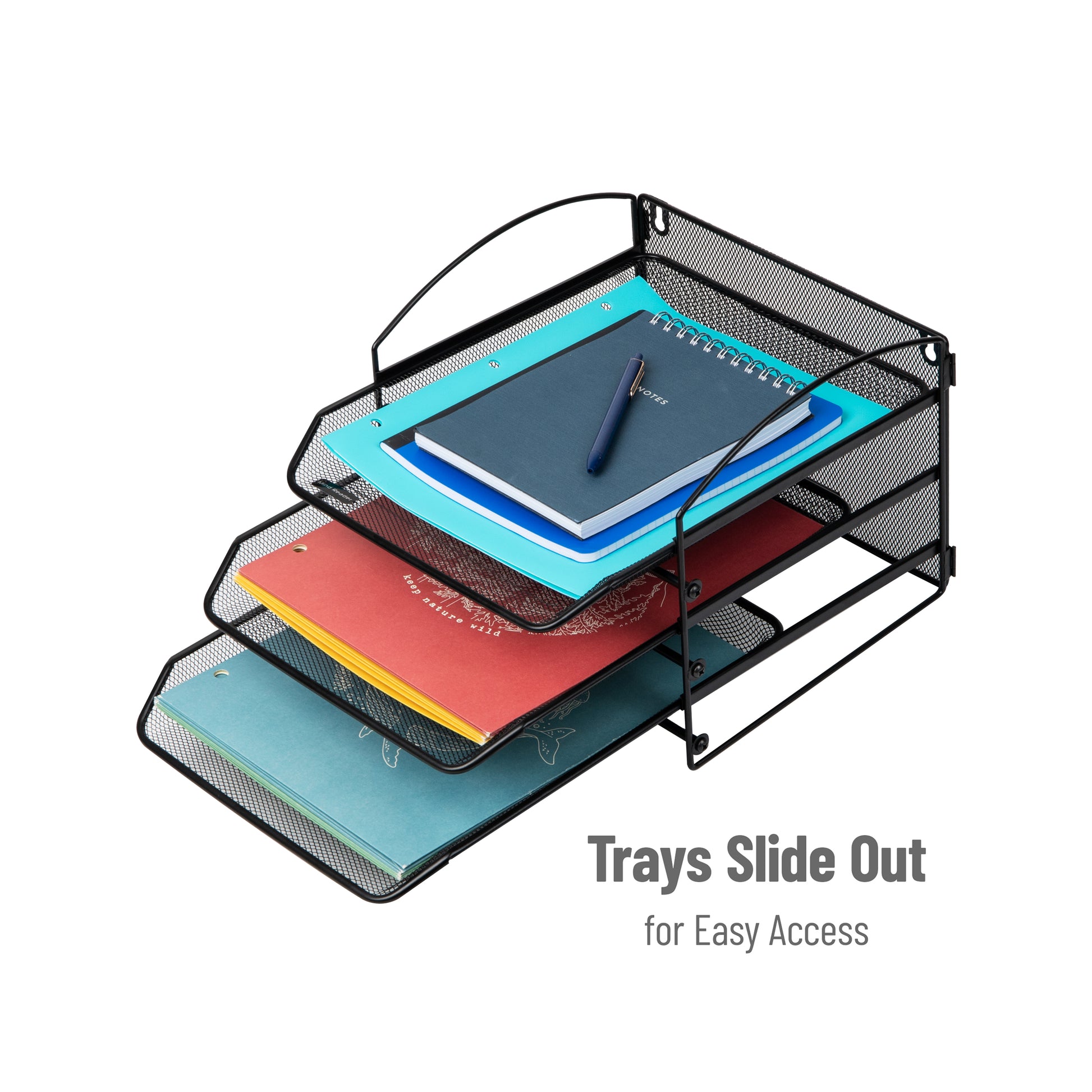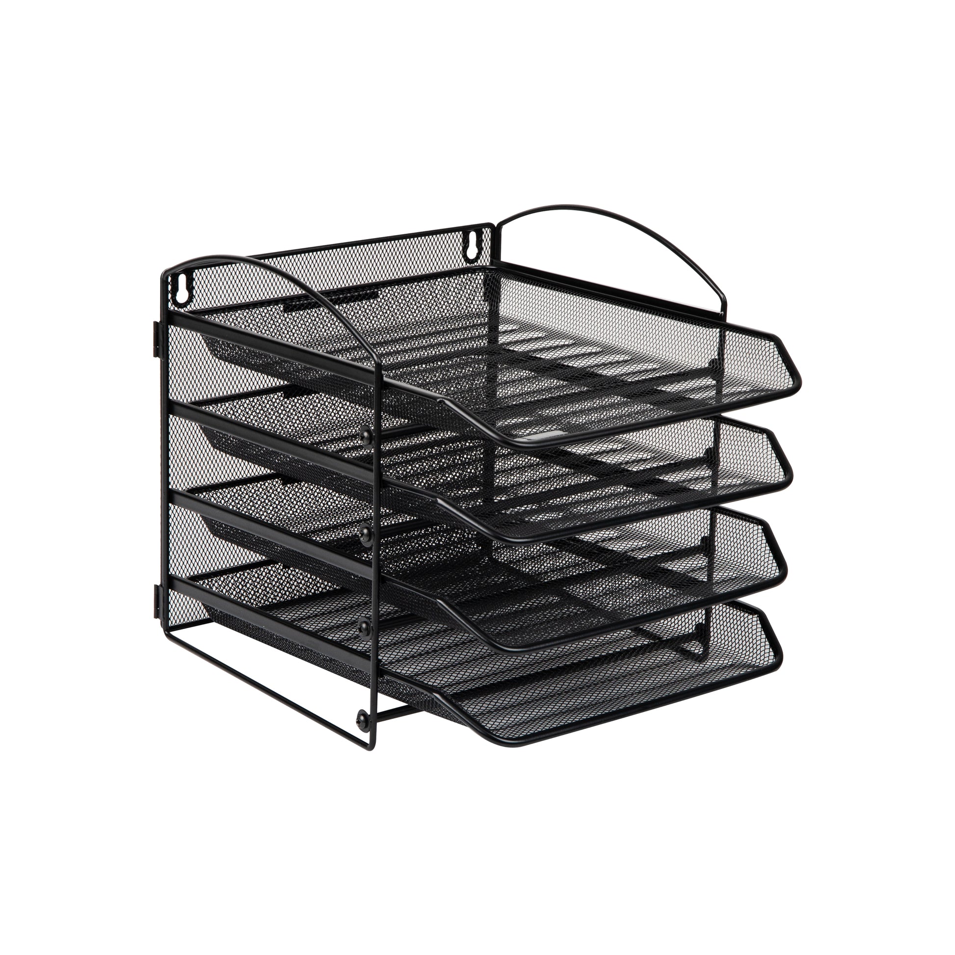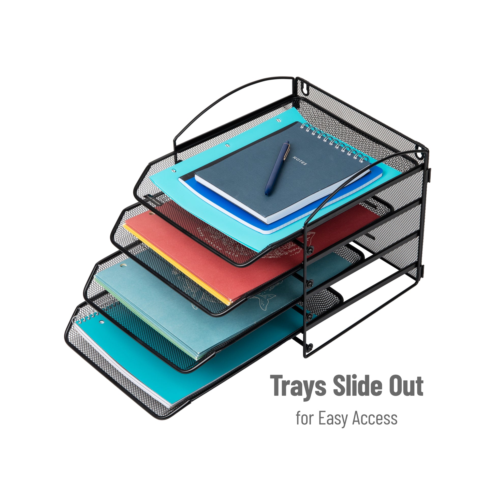 The tiers are slightly angled which lets you see your documents at a glance and the trays slide in and out for easy retrieval. The metal mesh construction lets you see through it as well. Although it is tall, it is still unobtrusive for most desk and countertop layouts. Use a screwdriver to assemble and hang your desk organizer, mounting hardware and assembly instructions are included. If the metal mesh needs to be cleaned, a wet cloth and mild soap can remove any dust or debris.