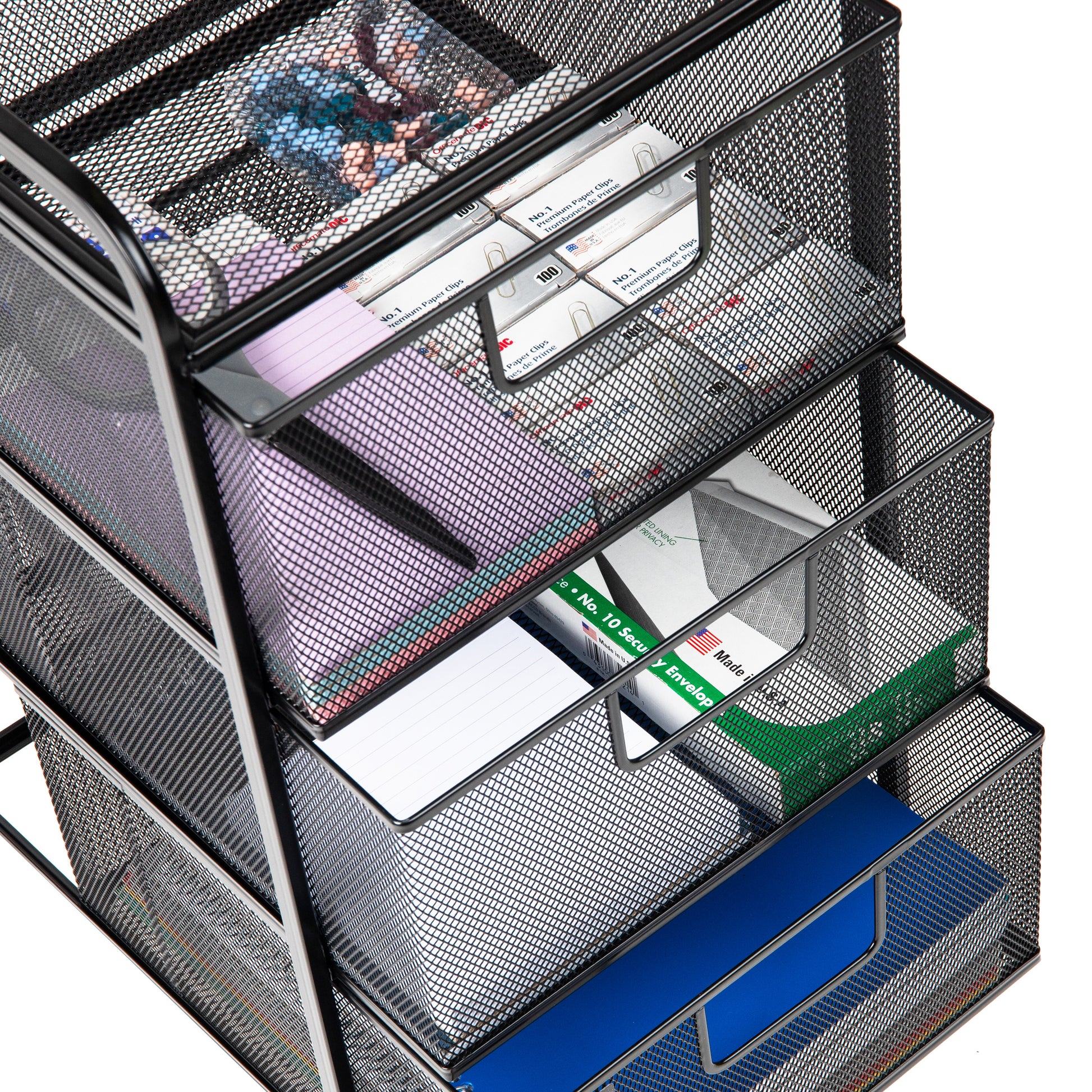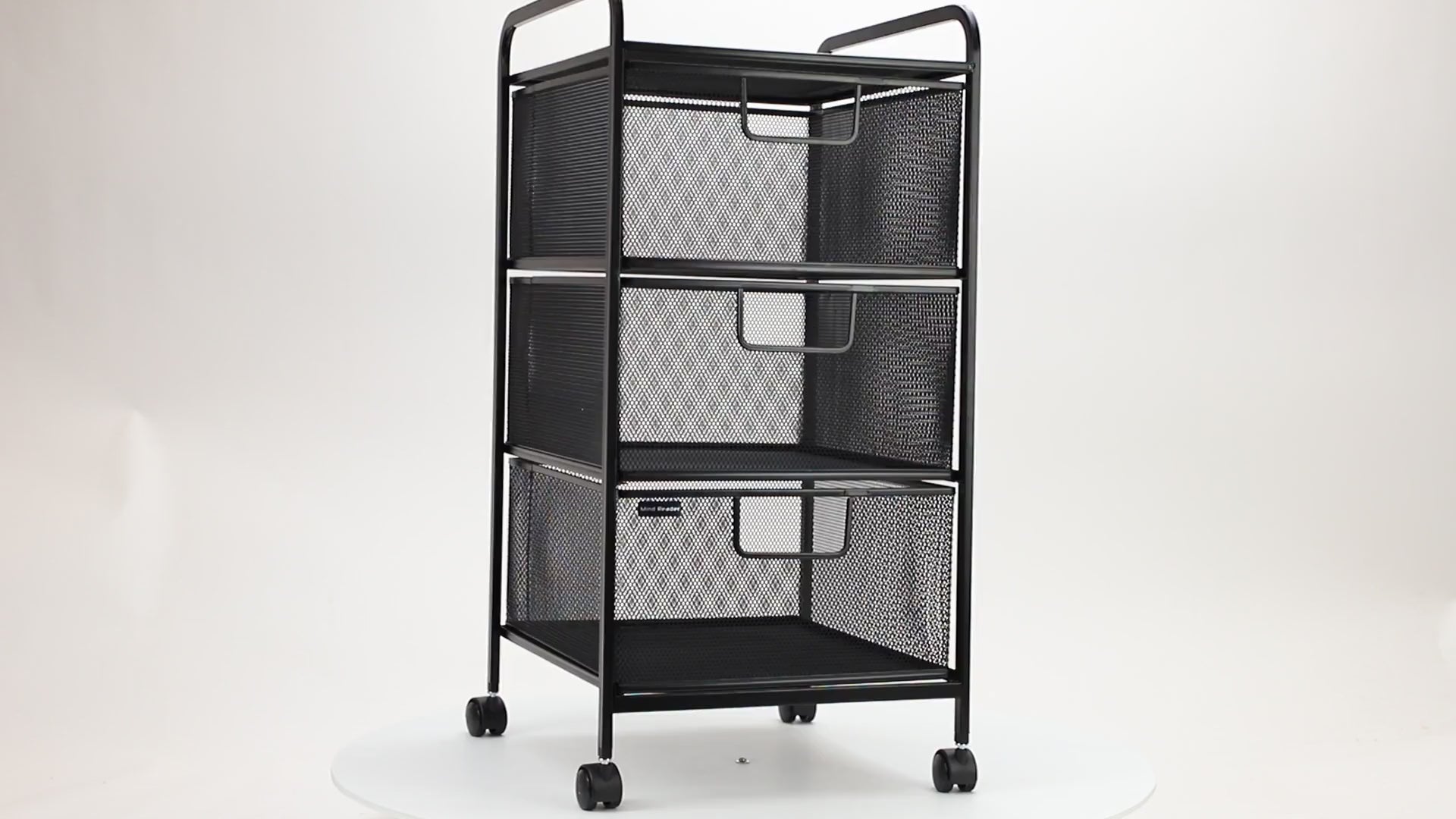 The cabinet includes three mesh drawers for storing office supplies, paperwork, or personal items. Each drawer glides smoothly and is fully removable. The entire unit arrives assembled—just push the caster wheels into place, or use it stationary without wheels if preferred.