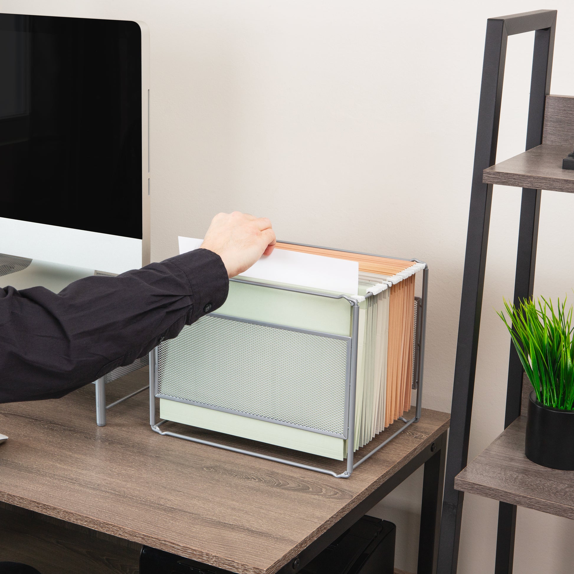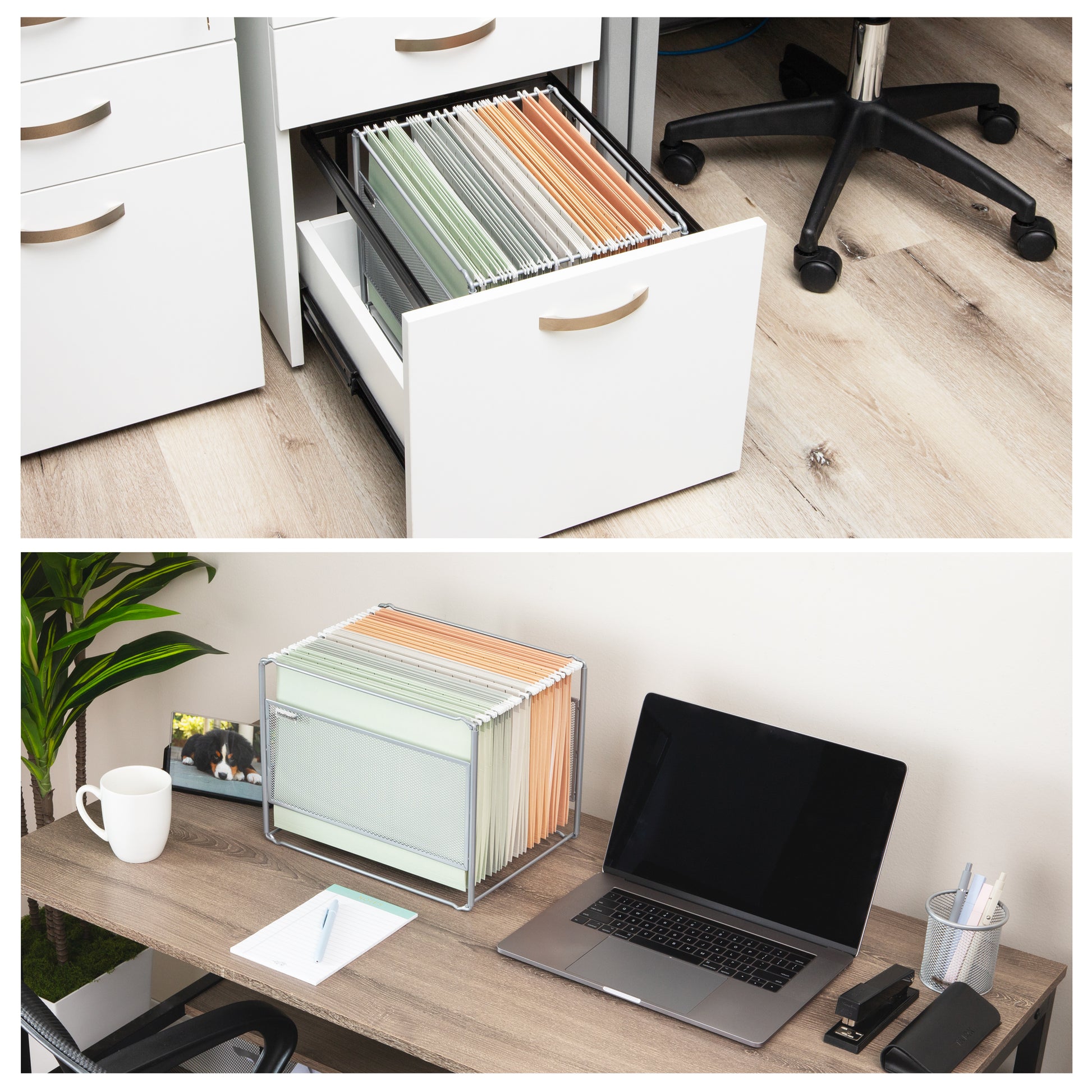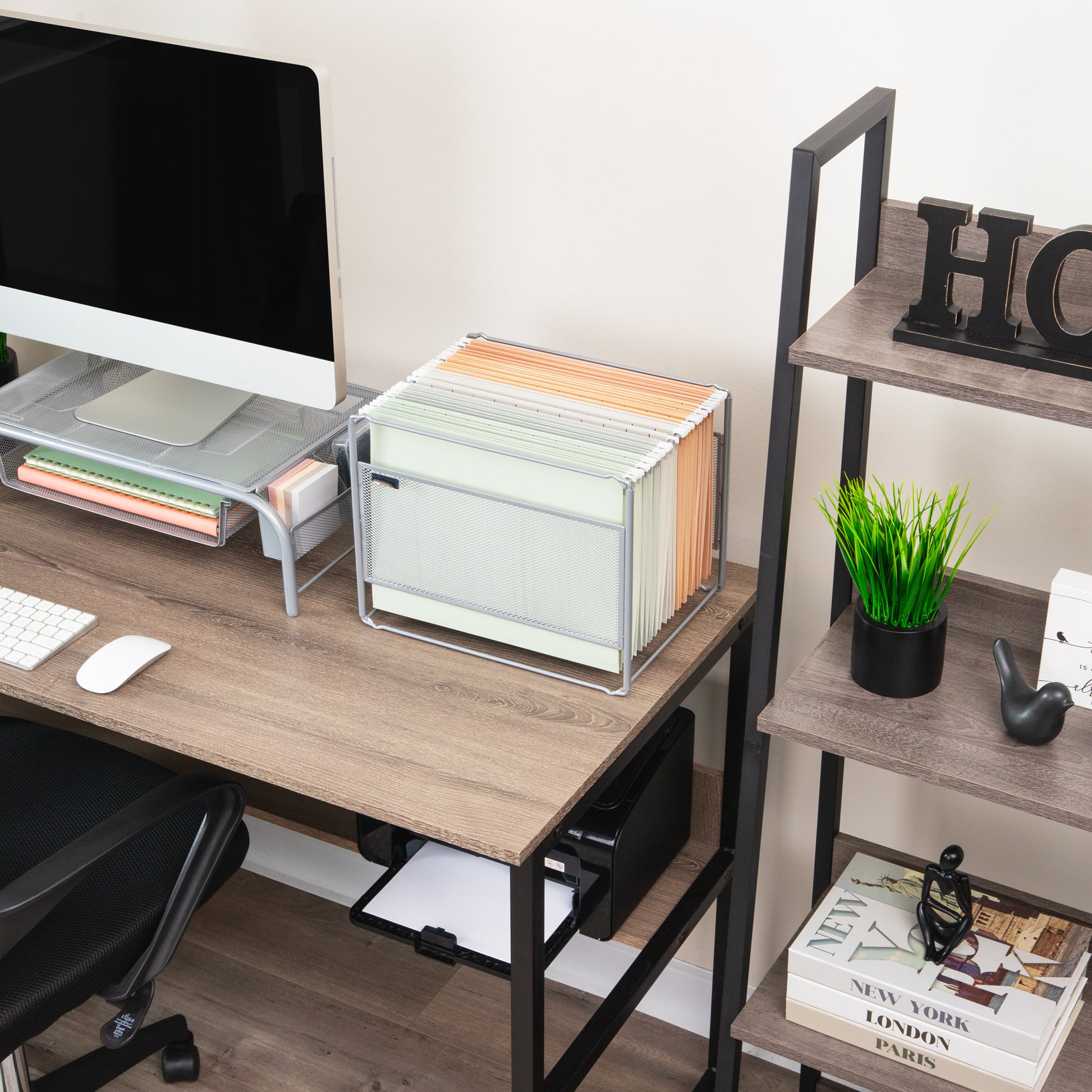 Transform your workspace with this sleek, modern hanging file desktop organizer. Perfectly designed to accommodate hanging vertical files with folders, important papers, and other documents, this organizer ensures everything is within easy reach. Its stylish design seamlessly blends with any professional or home office decor and doubles as a magazine rack for your living area.