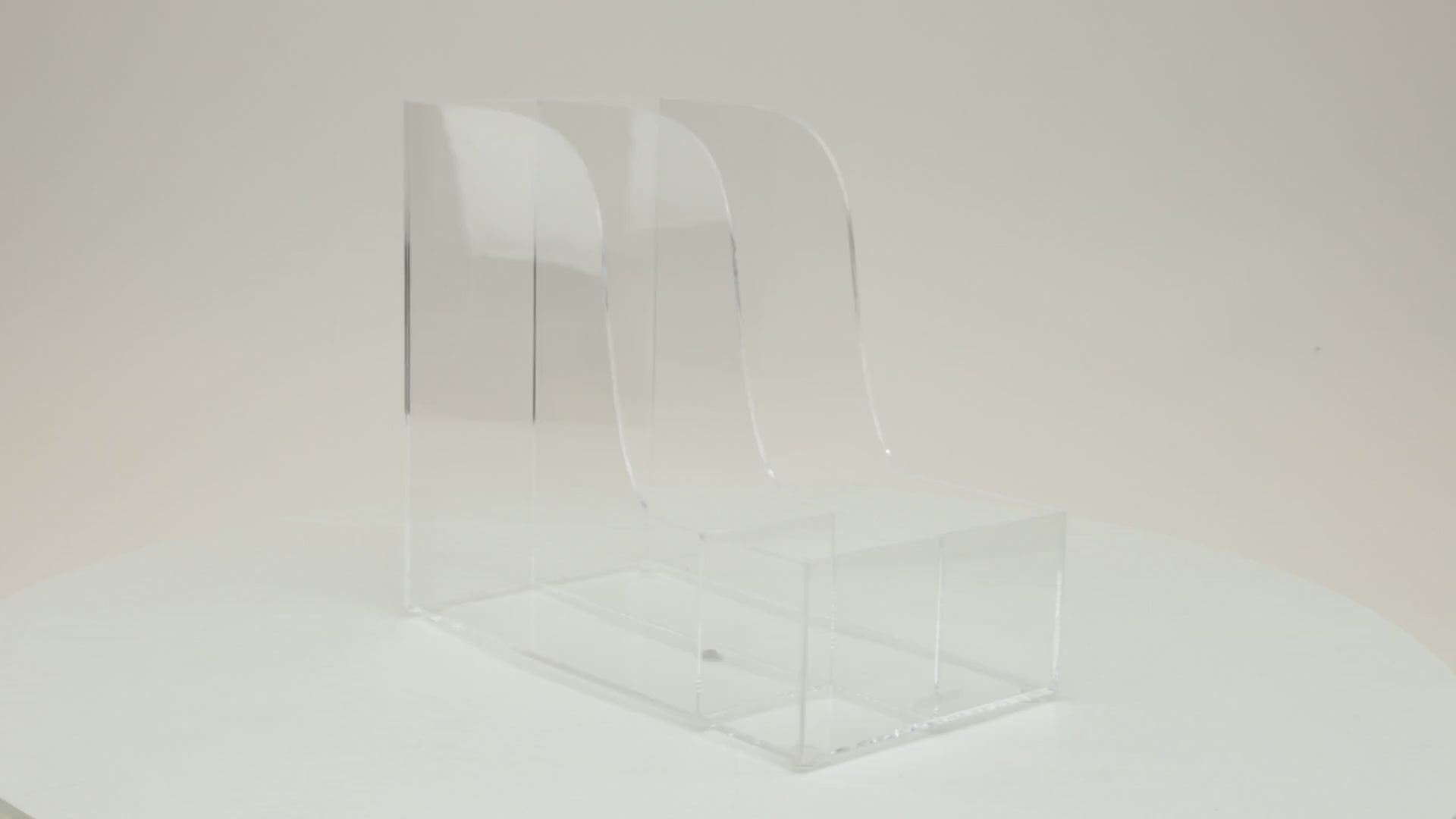 Boost your workspace efficiency and style with our two-section acrylic file organizer, the left side has a small section in the front for pens, scissors and other essentials. Its sleek design seamlessly integrates with any office decor, keeping your files organized and accessible while adding a touch of sophistication.